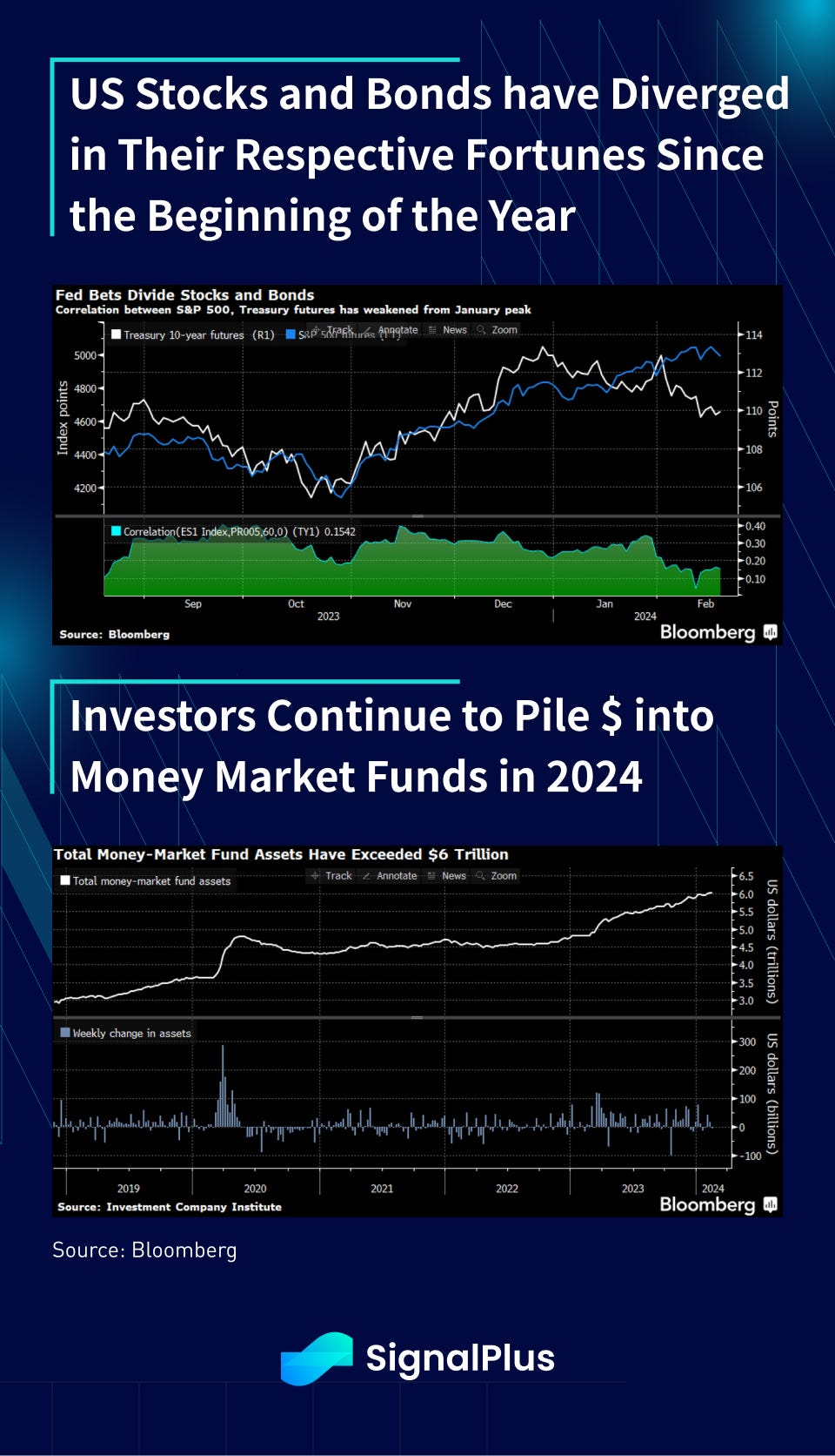 Over in equities, the rolling correlation between bonds and equities has continued to weaken in February, with equity prices staying close to all time highs, while bonds have been battered by a repricing of rate-cut expectations (higher for longer) over the past 6 weeks. Interestingly, as one of the key points we are paying attention to in 2024, investors continue to plow into money market funds with yet another $128 billion added to US money market funds since the start of the year, with total assets now balloning to a massive $6 Trillion — 3x crypto’s total market cap!