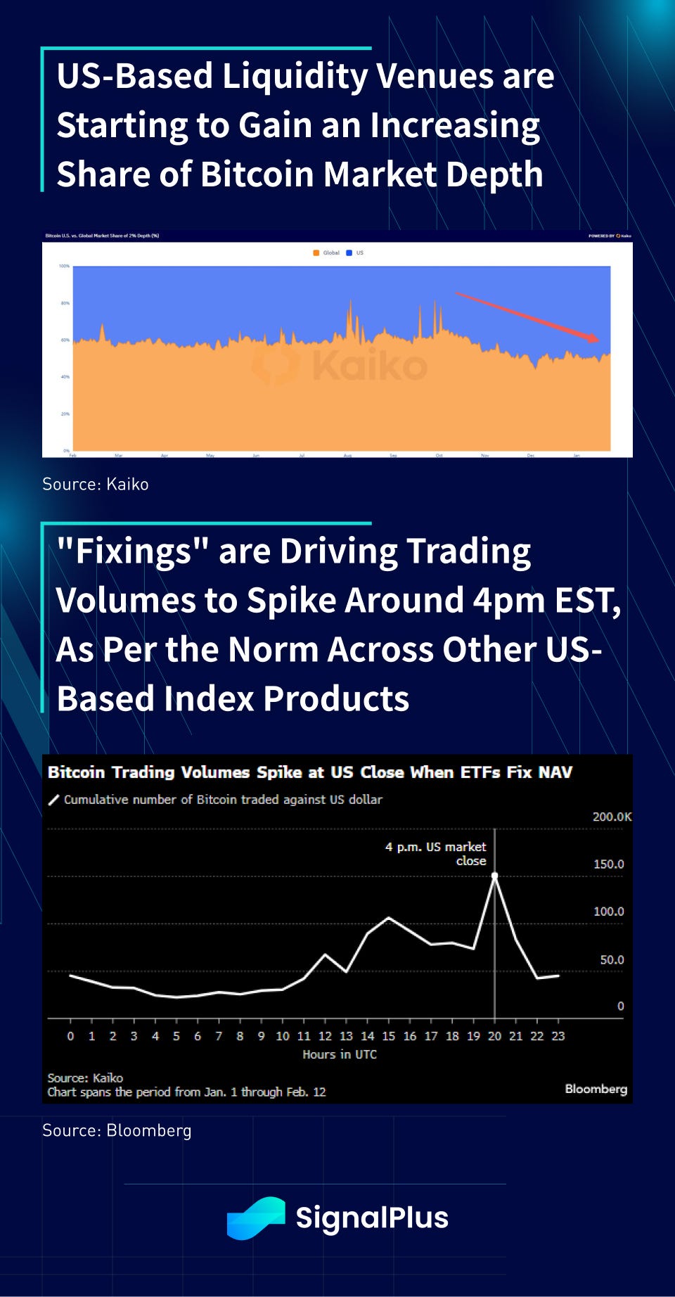 However, as something we’ve also alluded to before, this shift in focus to (TradFi) ETFs is also shifting the balance of power a bit back to the West, with US trading venues now accounting for an increasing amount of Bitcoin’s market depth based on data from Kaiko. Furthermore, similar to what we see with traditional index activity, trading volumes have also spiked into “4pm EST fixings” as ETF issuers mark their books, and we would expect this behaviour to continue as more US-based ETF products get listed. This ‘changing of the guard’ is a trend that we have been highlighting, and warrants continued attention as digital assets become further institutionalized in the foreseeable future.