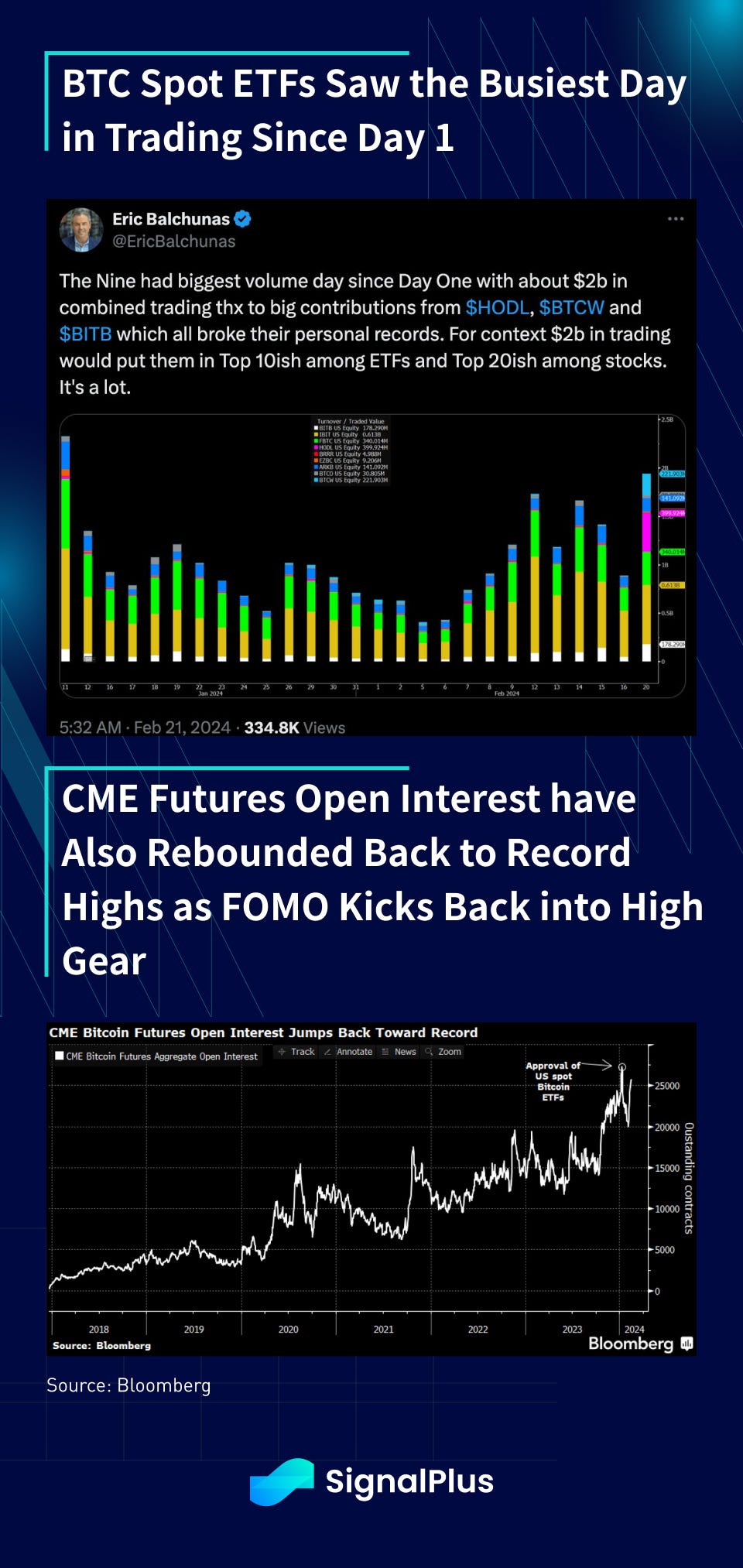 Over in crypto, sentiment continues to surge with ETH breaking above $3K, and the 9 new ETFs saw the biggest volume day ($2billion) since day 1 of trading. Bloomberg’s ETF analyst ranks this their collective activity to be around the Top-10 traded ETFs in US markets, an incredible feat given how early we are still with mainstream re-involvement. CME’s futures open interest has also rebounded back close to record highs after suffering at ETF-led drop earlier in January.