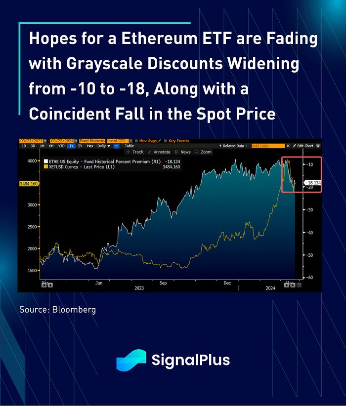 This confidential inquiry is coming during a tricky time, with signs suggesting that the ETH ETF might not gain SEC approvals in May, as the agency remains adamant that ETH remains a security. ETH prices have dipped along with the Grayscale Trust’s ETH discount widening from -10 to -18%.