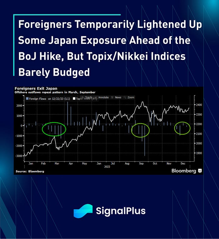 On the other hand, Japan remains an irregularity and continues to dance to its own beat with the only central bank to be hiking in the current cycle, with their stock market, real estate market and wage gains outperforming most of its peer group. Interestingly, while FDI and foreign inflows have been a major tailwind over the past 18 months, foreigners sold substantial equity exposure in December over concerns about the BoJ’s NIRP exit. However, and somewhat surprisingly, the TOPIX/Nikkei barely budged and have continued to forge new highs into and out of the BoJ hike. A similar pattern happened in September, where foreign outflows accelerated at the first signs of a policy change, only to pull a 180-reversal in October when things turned out to be a non-event. Will a similar pattern happen in the near future?
