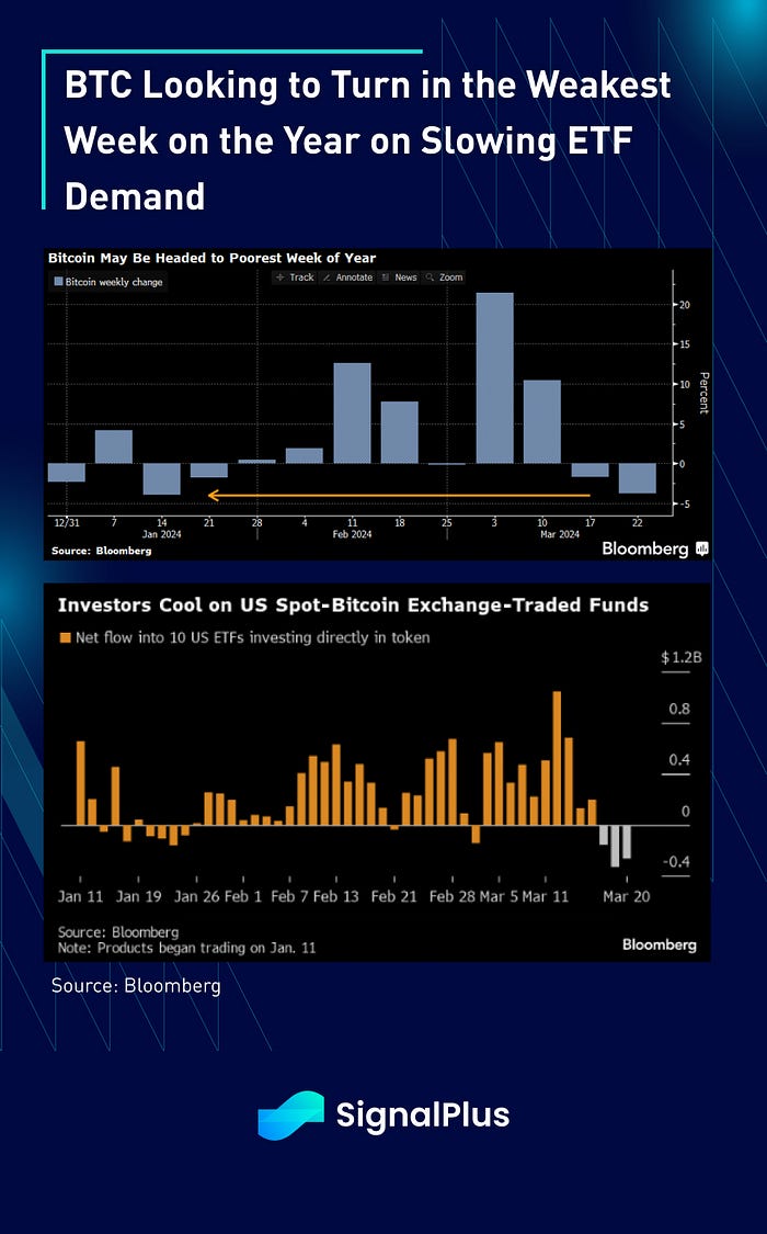 Finally, in crypto, the tone has turned more dour as Bitcoin is on track to turn in the poorest weekly performance of the year on slowing ETF demand. After hitting a string of daily record inflows topping over $1bln in the middle of March, net flows have turned decidedly negative over the last 3–4 years, coinciding with a slow down in price momentum as BTC is barely managing to hold above the $65k area despite the prevalent risk-on sentiment across nearly all other asset classes.