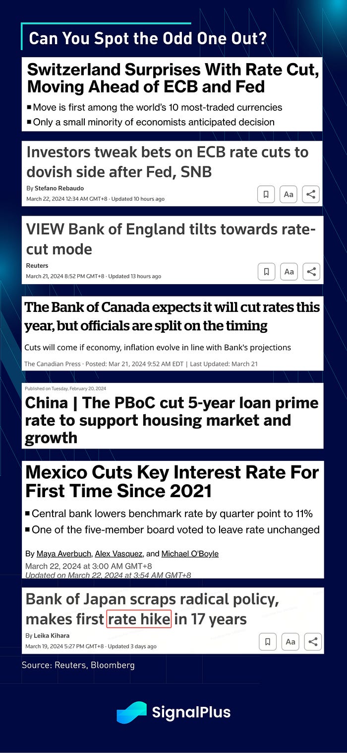Following the Fed’s dovish surrender yesterday, the SNB surprised the market by being the first major central bank to cut rates, and likely marking the start of a year of rate cuts across developed economies. The Bank of England followed suit with its own ‘dovish hold’ on an 8–1 vote, with the committee expecting CPI to run “marginally weaker” than expected, and the probability of a June BoE cut rising from 65% to 80%. ECB rate cutting odds are also nearly 80% in June following the Fed, BoE, and SNB announcements, while the Bank of Canada and China’s PBoC are also firmly leaning towards the accommodative stance given lacklustre growth.