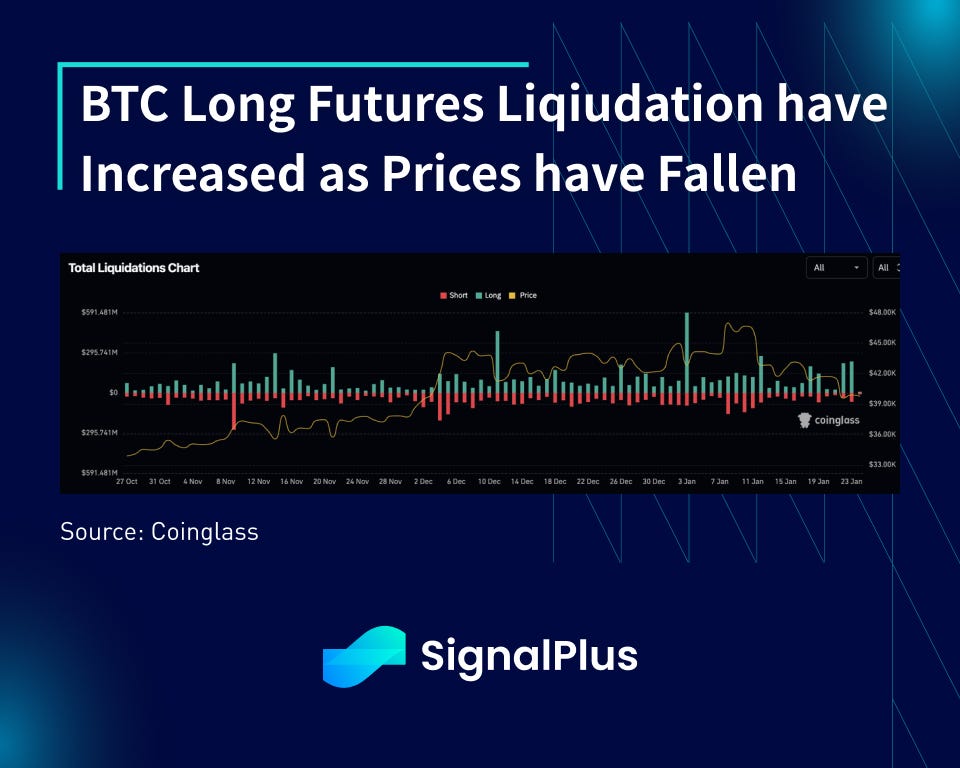 Speaking of a waning honeymoon, crypto prices continue to be weak as it’s been more of the same with GBTC outflows weighing heavily on markets. Lack of near-term catalysts and inflows (those will happen over months and quarters, not days as we’ve written) are causing mercurial traders to lose faith in the short-run, with long-future liquidations picking up steadily over the past few days.
