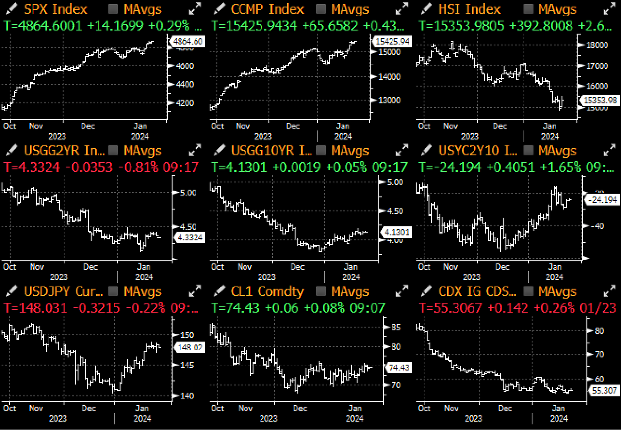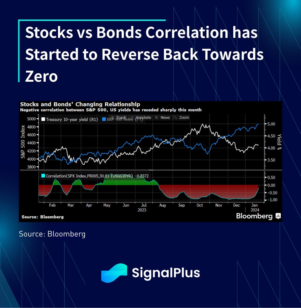 Markets were quiet overall as we await a very busy week next week ahead of the Fed, Treasury QRA, NFP and month-end. Earnings will also be in full blown mode, so traders are understandably keeping their powder dry this week. Equities and bonds have also reverted much of its negative correlation they enjoyed over the past 6 months (a requirement for portfolio diversification benefits), and their resumption towards zero (or worst, positive) might exacerbate asset pricing moves in February, reminiscent of the 2Q2023 sell off and much of 2023. The easy part of the risk-on trade looks to be over in the near-future.