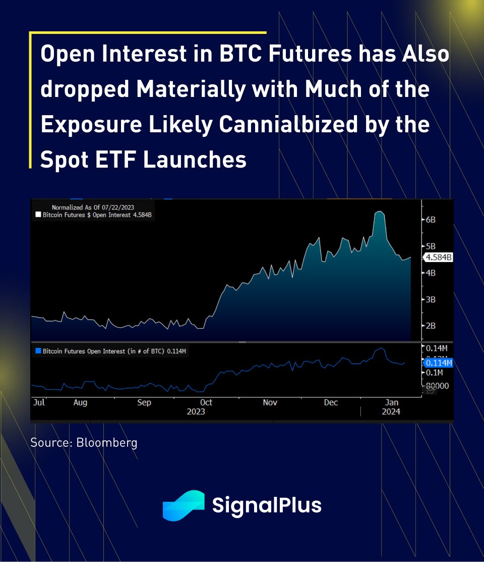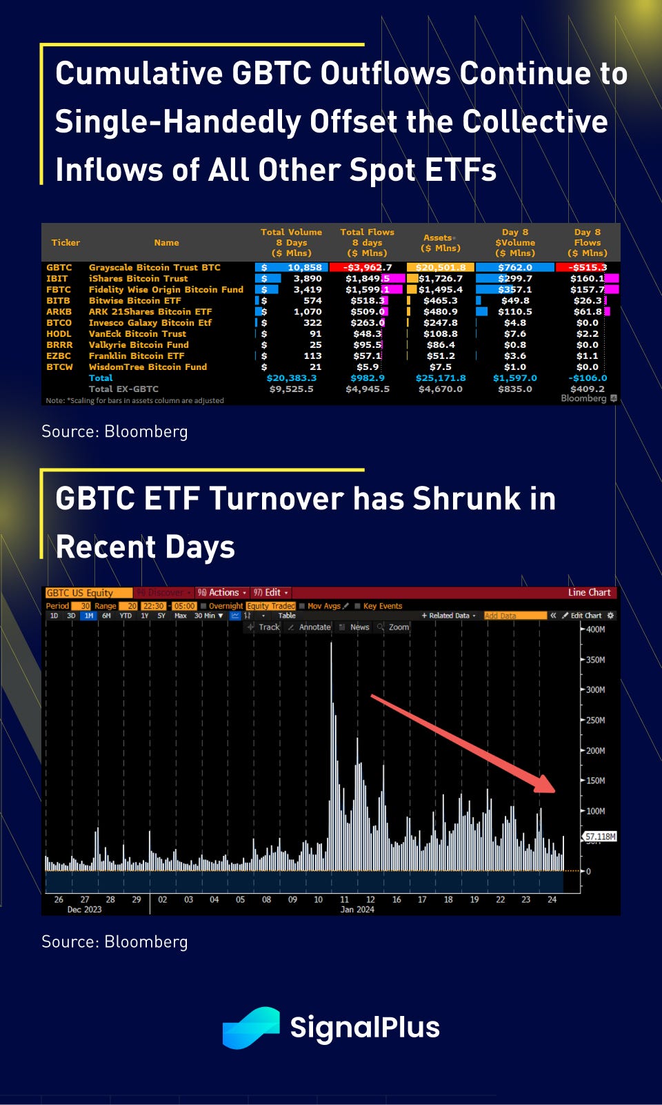 Nevertheless, the market mood remains heavy, with cumulative GBTC outflows almost single-handedly offsetting the collective inflows of the other 9 ETFs. Furthermore, the trading turnover (not pure volume) of GBTC has been shrinking over the past few days, and BTC futures open interest has shrunk materially as some of their activity has been cannibalized by the spot ETFs. All in all, prices will likely continue to normalize and ease off in the near-term, as the market continues to work through the short-term outflow imbalance and lack of immediate positive catalysts.