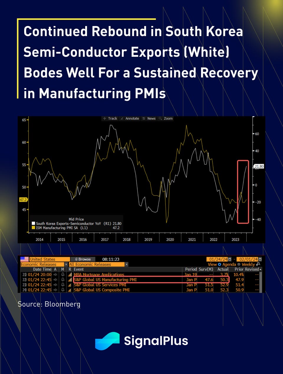 In North American markets, the US PMI release coincided with the Bank of Canada rate decision, which saw continued pressure on bonds as manufacturing data came in stronger, while the BoC left key passages over lingering inflation concerns despite keeping rates on hold. US Manufacturing PMI increased to 50.3 from 47.9, with the majority of improvements coming from new orders (52.3 from 47.1), while Services PMI also surprised higher at +1.5pts versus last month. A continued rebound in South Korean semiconduct exports (YoY%) continues to bode well for a sustained manufacturing recovery, with the former being a statistically significant leading indicator for global PMIs.