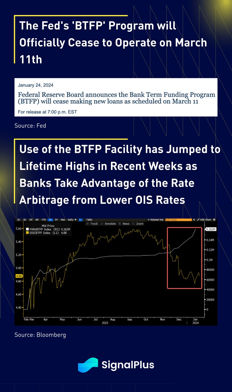 On a separate note, the Fed has announced that the aptly-named ‘BTFP’ (Bank Term Funding Program) will officially cease on March 11, ending the emergency protocol that was created in the wake of the SVB crisis. The program’s uptake has recently jumped to all the highs, as Wall Street banks have taken advantage of (abused) the rate arbitrage available thanks to the drop in implied OIS rates to borrow-and-repark back in the system. As the old saying goes, ‘never let a good crisis go to waste’, and investment banks are surely masters of taking that advice to heart.