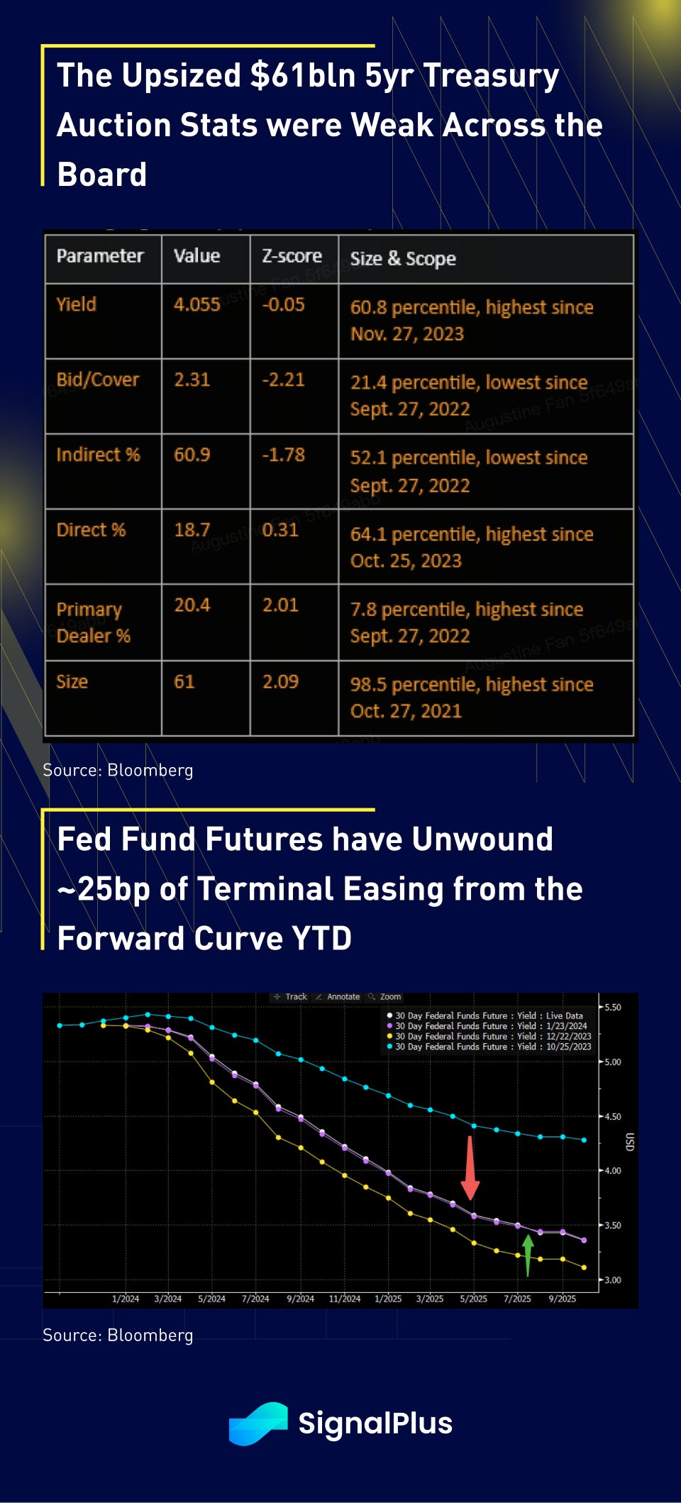 The $61bln 5yr treasury auction proved to be a hard pill for the market to swallow, with the issue coming with a massive tail at +2bp back from market pricing, and the 2.31x bid to cover ratio meaningful below the 2.52x average. Internals were weak across the board, with many metrics sitting at close to 6-month lows, and the weak result pushed yields another 5bp higher on the day. Furthermore, the recent bond sell-off has effectively removed around ~25bp of terminal easing since the beginning of year, with ‘only’ 125bp of easing priced in 2024 instead of 150bp+ earlier in the month.