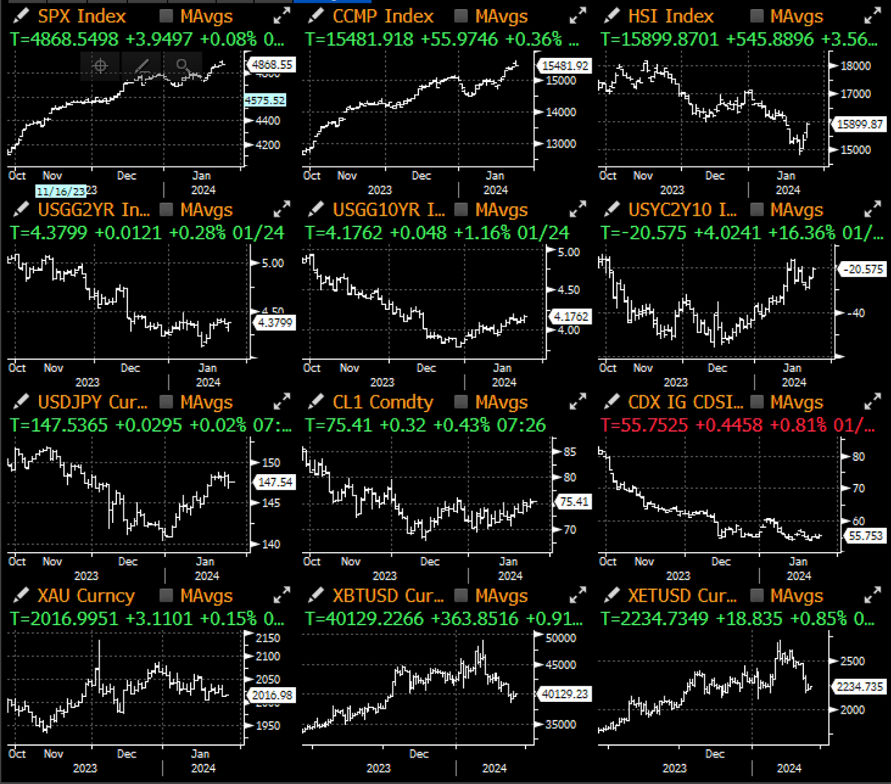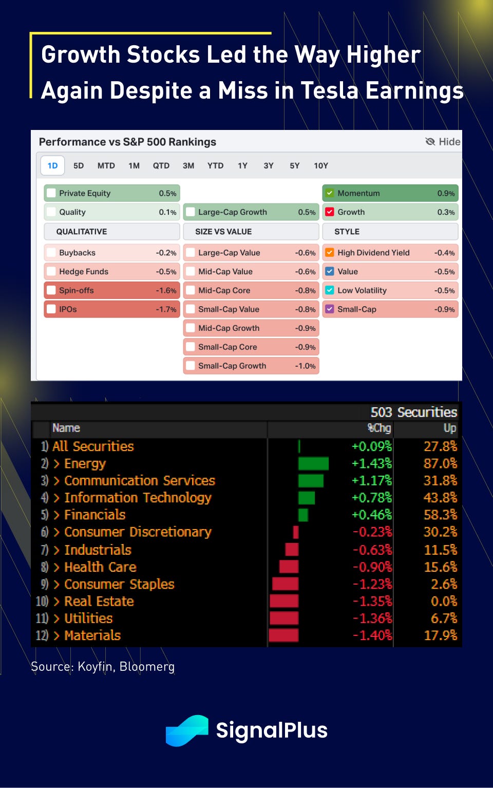 Equities closed the day with a small gain, giving back some of the early day strength from the China easing boost. Energy and large-cap tech stocks led the way up once again, despite Tesla reporting disappointing earnings as the 1st of the ‘Magnificient 7’ failed to impress. Earnings, revenue, and gross margin all came in below estimates, and the company warned that volume growth may be “notably” lower in 2024. The next 2 weeks will see a peak in earnings announcements, coming right in time with a slew of important macro indicators around month-end.