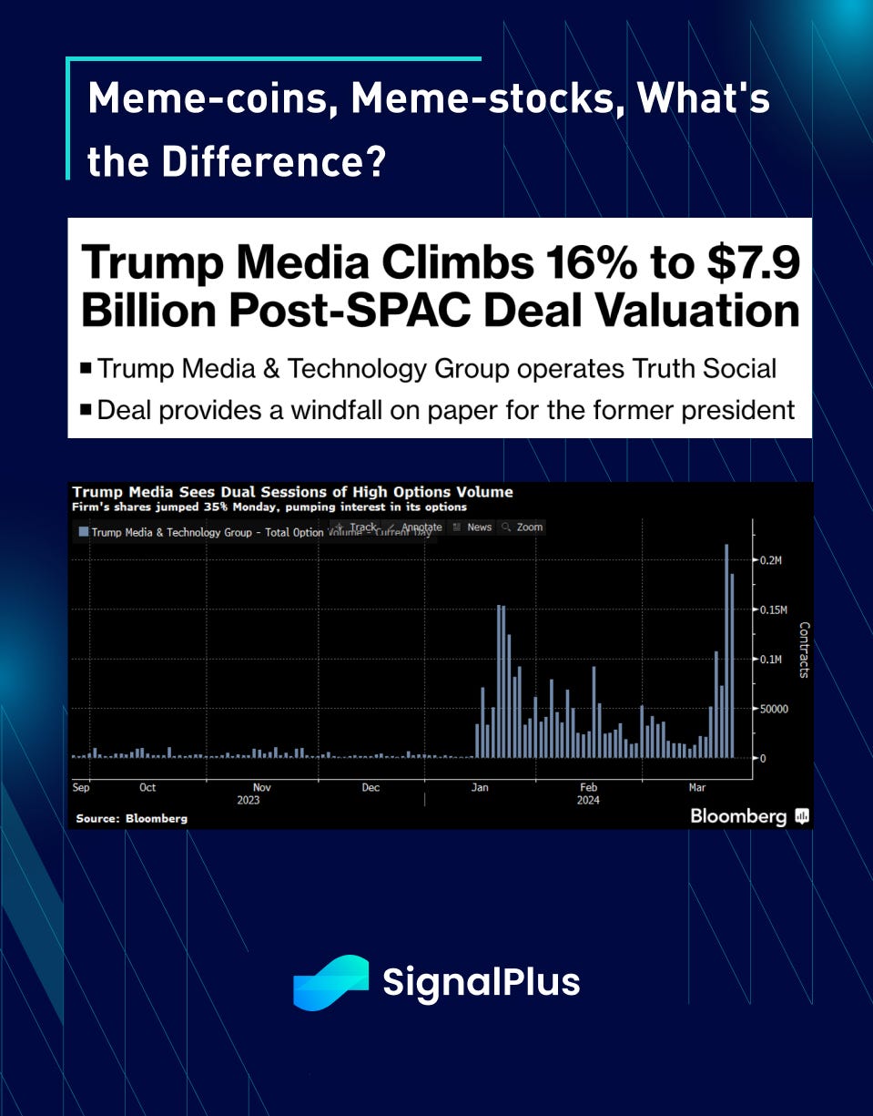 While institutional investors are taking a break, retail users have been busy with their share of total options volume hitting an all-time high earlier this year. The excitement helped push average daily options volume in February to its highest on-record, with former President Trump’s SPAC deal the latest recipient of the retail inflows with the stock climbing 16% to an improbably $8bln valuation after the 1st day of trading. Who says only crypto gets to have fun with meme-coins?