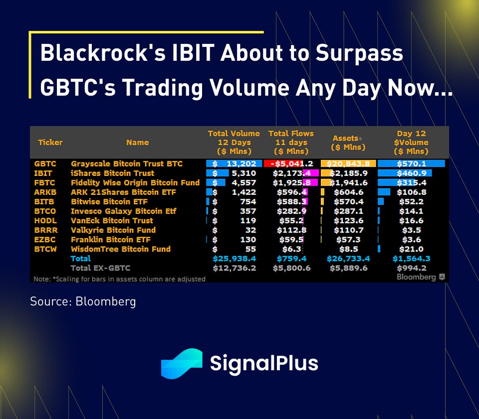 In crypto, Blackrock’s IBIT is inching ever closer to surpassing GBTC on volumes traded, just as GBTC outflows are finally showing some signs of slowing down, and spot prices have bounced accordingly with BTC back above $43.5k.