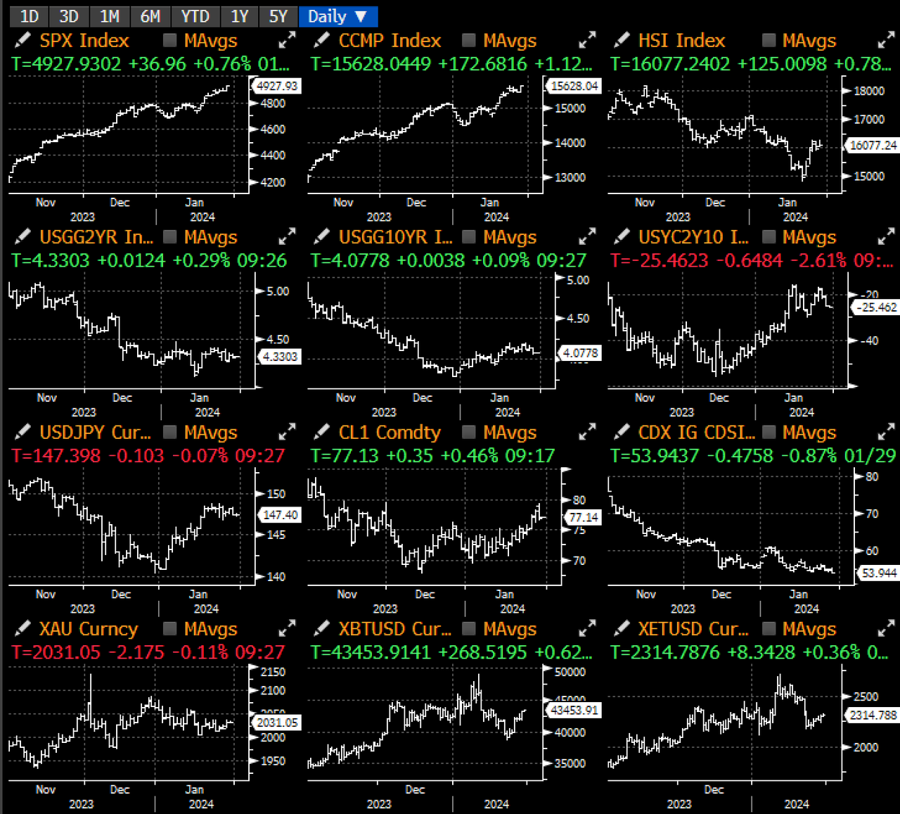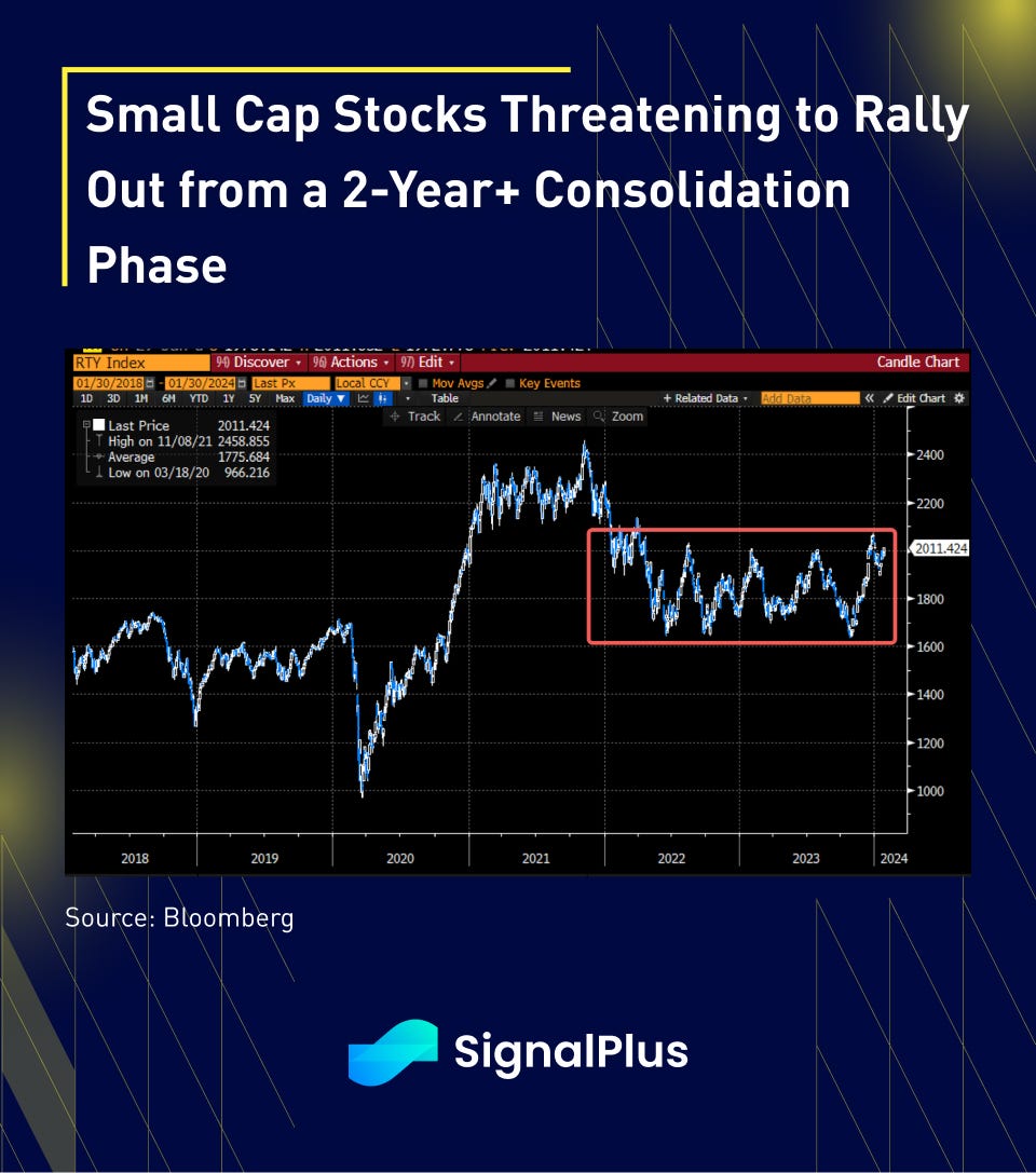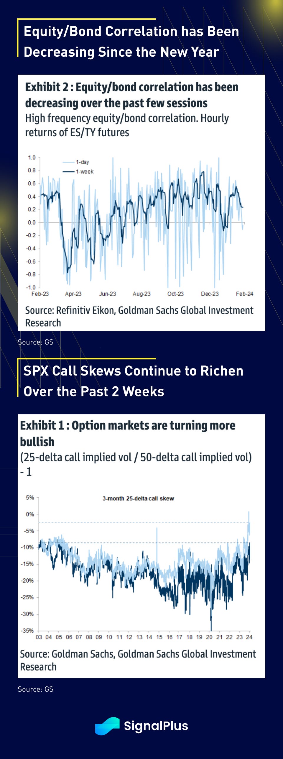 Equity / bond correlations have continued to fall, with stocks continuing to rise despite some repricing in rate cut expectations since the beginning of the year. A combination of decent economic data, coupled with dovish global central banks (cuts are a matter of when, not if) are still driving risk sentiment on, to the frustration of bears. Option markets have reflected this with call skews richening substantially in the SPX over the past 2 weeks, and even small caps are looking like they are about to break out from a 2-year long consolidation. Grinding bull markets are often the hardest to trade.