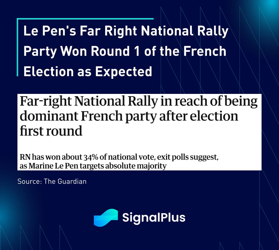 Meanwhile, round 1 of the French election went to Le Pen’s National Rally group as expected this weekend, with the far-right group winning 34% of the national vote and is on pace to gain a parliamentary majority.