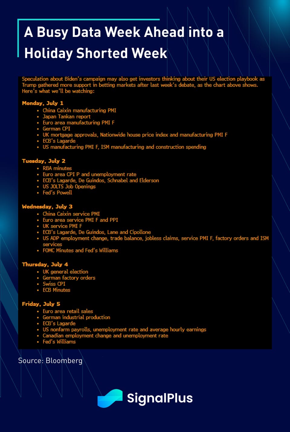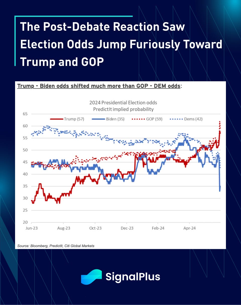 On the politics front, the 1st US presidential debate started with some excitement as President Biden delivered an underwhelming performance that was worse than the lowest of expectations given concerns over his age and health. On the other hand, former President Trump delivered a relatively controlled performance (by his standards), with the post-debate reaction swift and significant as the Trump-Biden election odds widened to +22 points vs +10 prior to the debate. Beyond the head to head, Biden’s odds (35%) are now -7 points below the Democrat’s odds of winning (42%), while both Trump’s and GOP’s odds are now coming in substantially above 50%.