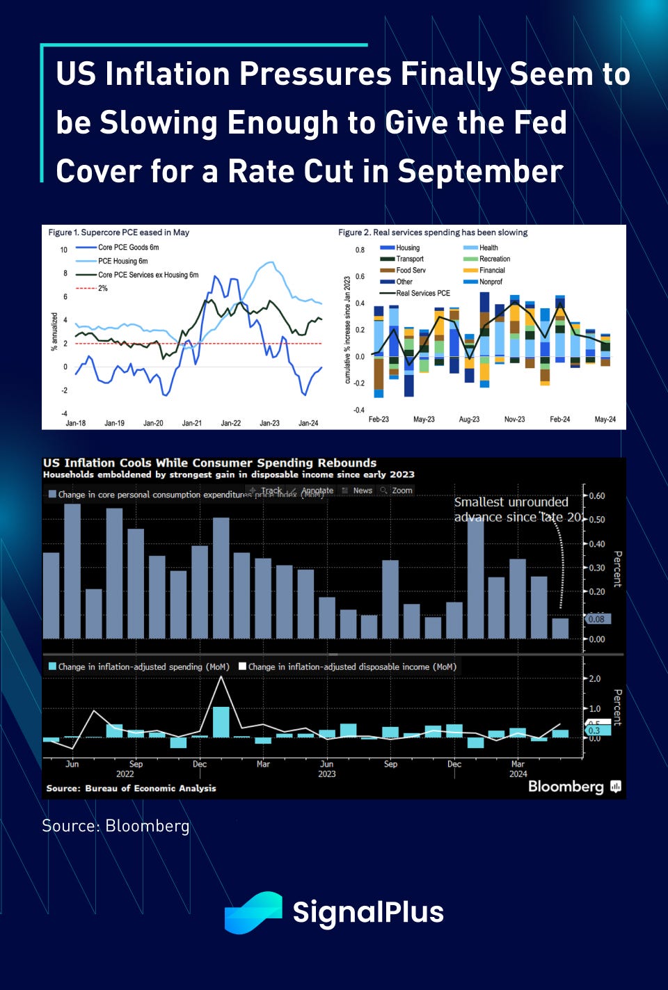 Next, on the inflation side, pricing pressures appear to finally be slowing down after a lot of stop-and-go disappointments. Friday’s PCE release rose 0.08% in May, softer than consensus expectations with ‘supercore’ PCE up only just 0.1%, helping to crystallize a Fed rate cut that looks likely to arrive in September.