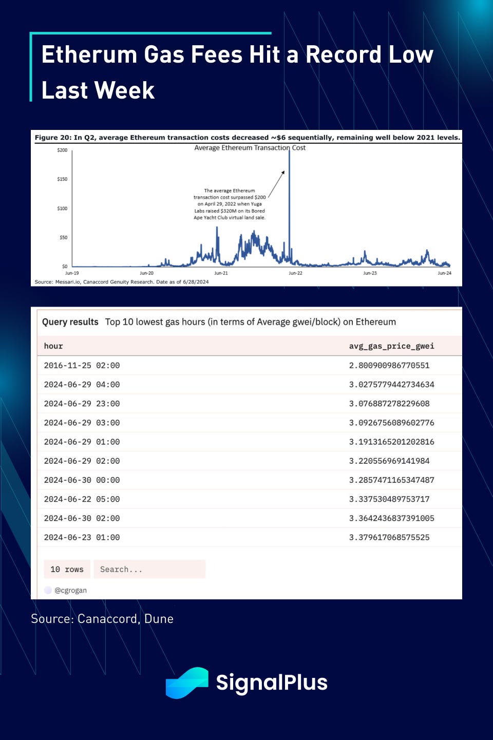 Ethereum was similarly disappointing, with expectations of its own ETF approval failing to draw up any long-lasting excitement over the OG mainnet, and concerns about L2 activity cannibalization and dwindling fees / inflationary supply (L1 fees plummeted to historical lows last week) continue to raise existential and long-term structural questions from the community towards the Ethereum foundation.