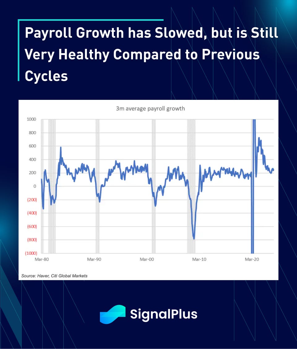 However, even at their more subdued levels, economic activity remains at a high level compared to previous cycles, with this week’s NFP still expected to come in at around 190k with a 4% unemployment rate and still a positive growth in average hourly earnings of 0.4%. At the current pace, 3m average payrolls are still coming in at around 249k versus an average of 181k in the 2010–2019 pre-pandemic period.