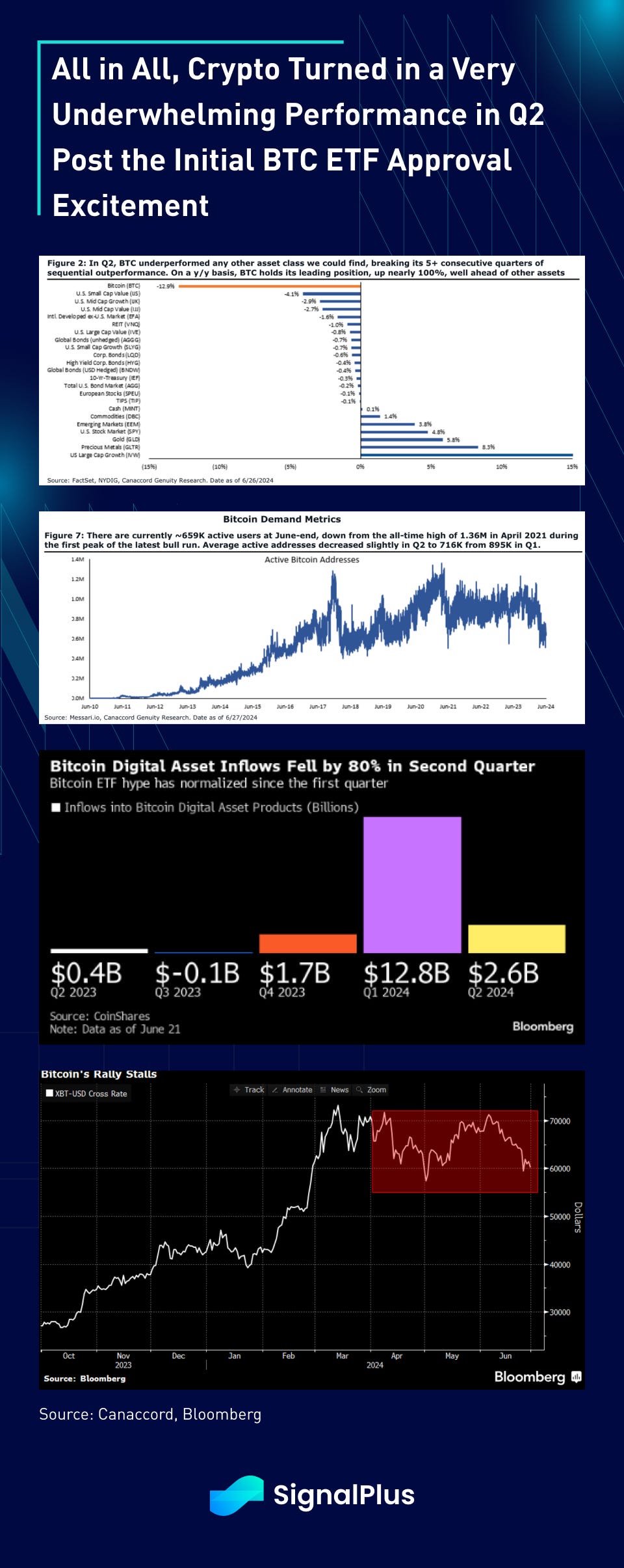 On crypto, Friday ended a very disappointing quarter with BTC registering a -13% loss for Q2 following a long period of outperformance, as slowing digital inflows, lack of substantial mainstream tech innovation, falling demand metrics, and pending supply concerns (Mt. Gox, govt sales) added to crypto’s owes with BTC unable to break out of the 60–70k range.