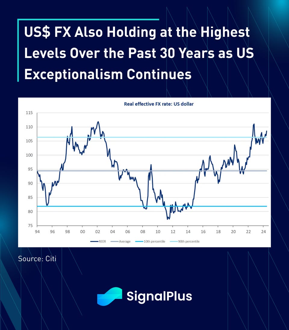 Not to be outdone, the USD has also been holding up strong and is at around the highest levels on an effective rate basis going back the past 30 years, thanks to continued capital inflows spurred by AI, a robust economy, and high base interest rates. US capital market exceptionalism continues to outperform the most skeptical of doubters well in 2024.