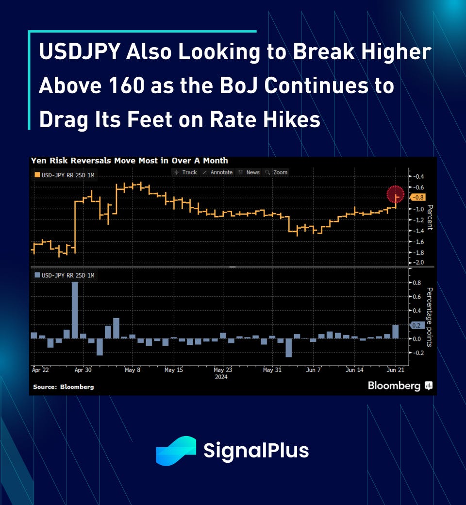 Pressures are growing in the Yen as well, with USDJPY approaching 160 and the street estimating that the MoF only has around $200–300bln of intervention capital left, and BoJ officials still dragging their feet on rate hikes. Markets are braced for a move towards 165 before they expect to see the next wave of BoJ intervention over the next month or two.