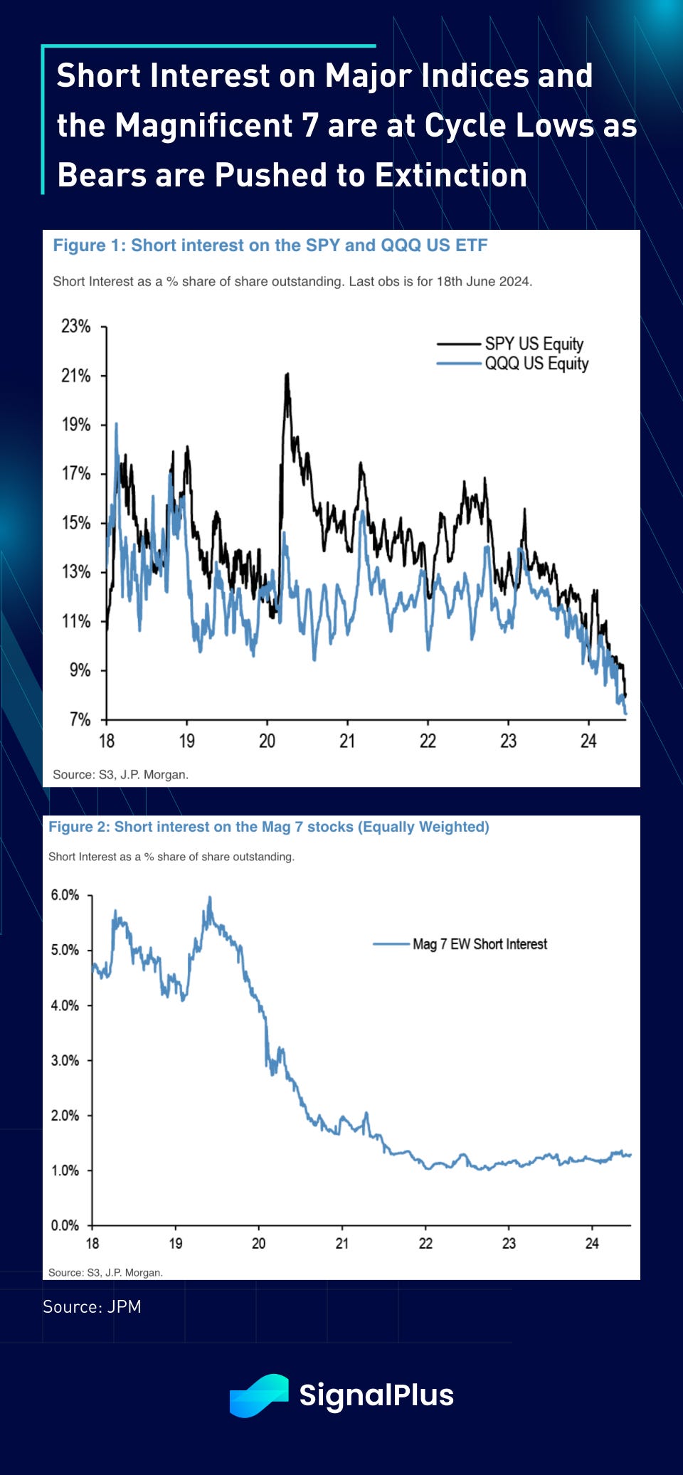 Equities ended Friday in the but it was another robust week all around for the main index. Banking dealers reported continued short-covering all week as the main index refused to budge, with core PCE on Friday to be the biggest data release this week. Thin market breadth and continued narrow leadership remain a persistent thorn for equities, though so far they have not yet translated to any material weakness. Short-sellers continue to be obliterated into extinction, with short interest on the SPX, Nasdaq, and the ‘Magnificent-7’ at multi-year lows. Don’t fight the tape.