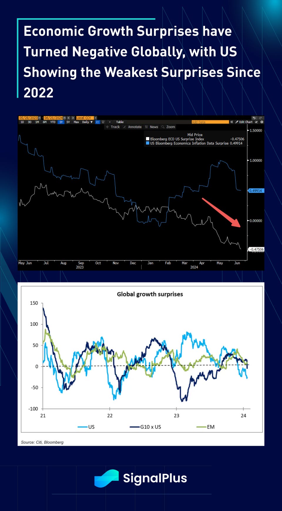 On the economic side, we are seeing further signs that the US is finally slowing down, with US growth surprises trending to the lowest levels since 2022, with the rest of world also joining the US in negative territory.