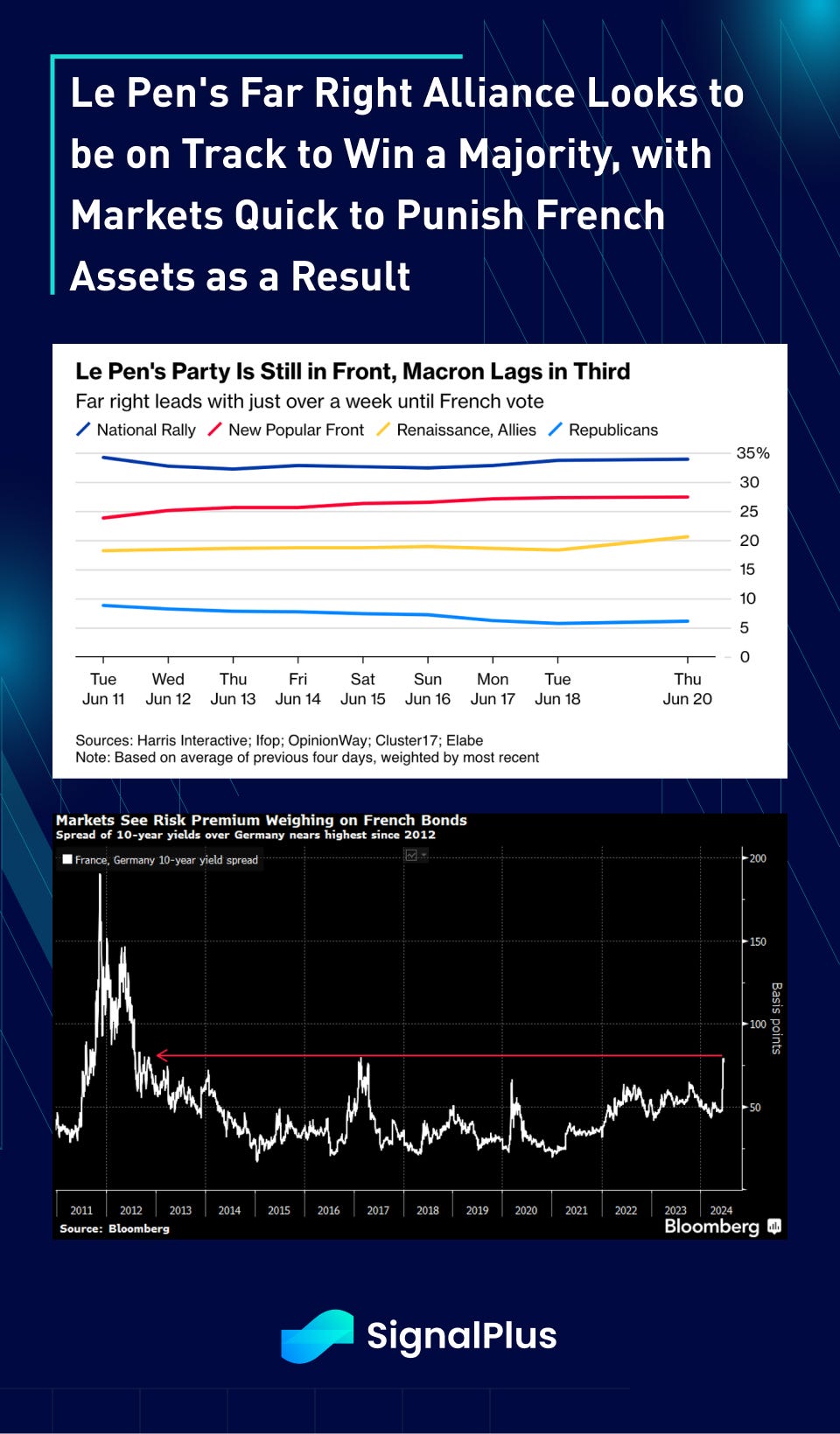 France will see its own election begin on June 29/30, and round-2 taking place on July 6/7. Markets have done its work to punish French assets with OATs widening (cheapening) to the widest levels vs bunds since 2012, with Le Pen’s National Rally party still comfortably in the lead, with a far-right alliance looking to establish a clear majority.