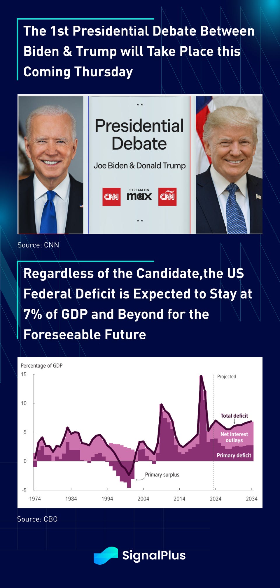 With the mid summer approaching and equity markets continuing to scale the wall of worry, attention shall begin to shift towards politics going forward, with Thursday’s US election coming in as the earliest in history with high stakes. Betting odds have shifted heavily in favour of ex-President Trump following the court-ruling, though both candidates are likely going to keep pursuing an unsustainable expansion in US fiscal policy anyhow. The CBO raised the 2024 deficit to 7%+ of GDP, and are expected to be floored at that level for the foreseeable future.