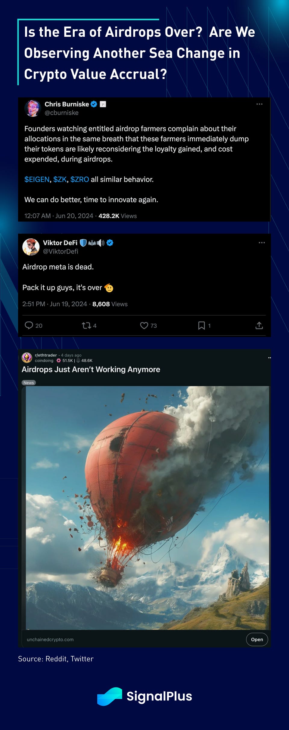 While we have long discussed the difference of this cycle, where a rally in majors was unlikely to lead to positive spillovers in altcoins/NFTs, the native market was especially hard hit last week with various airdrop ‘conspiracy’ with reputable DeFi projects. Without going into the nuanced details, many natives had been diligently farming airdrops as the new ‘alpha’ over the past year, but significantly lower-than-expected announced payouts from the likes of zkSync, Layer Zero, Eigenlayer and the likes have shattered confidence in the sector. In fact, the uproar has been so large that it’s leading to a lot of chatter about the airdrop ‘era’ being over. Along with cratering NFTs, memecoins, and Ethereum L1 fees, are we due for another seismic change in the native ecosystem? It certainly has been an interesting year, to say least.