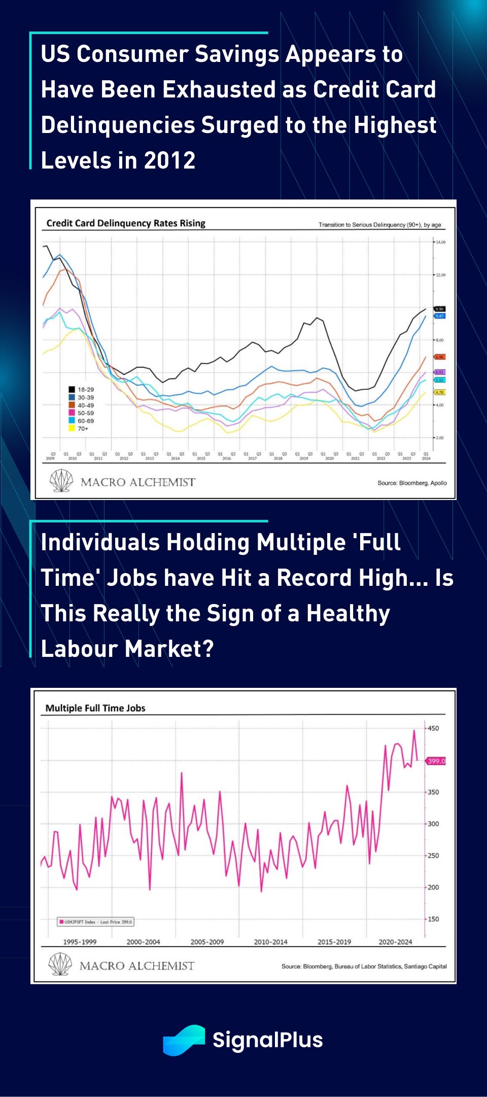 Furthermore, the teflon US consumer is also finally showing some early signs of capitulation, with credit card delinquency rates rising to the highest levels since 2012, as the pandemic era savings have been fully spent. On the labour front, while the headline growth numbers have been decent, data seem to suggest that a record number of employees are holding multiple ‘full-time’ jobs, which one can read as there is too much demand for labour, or that individuals need to maintain multiple income roles to sustain the escalating cost of living. Our bias is towards the latter camp.