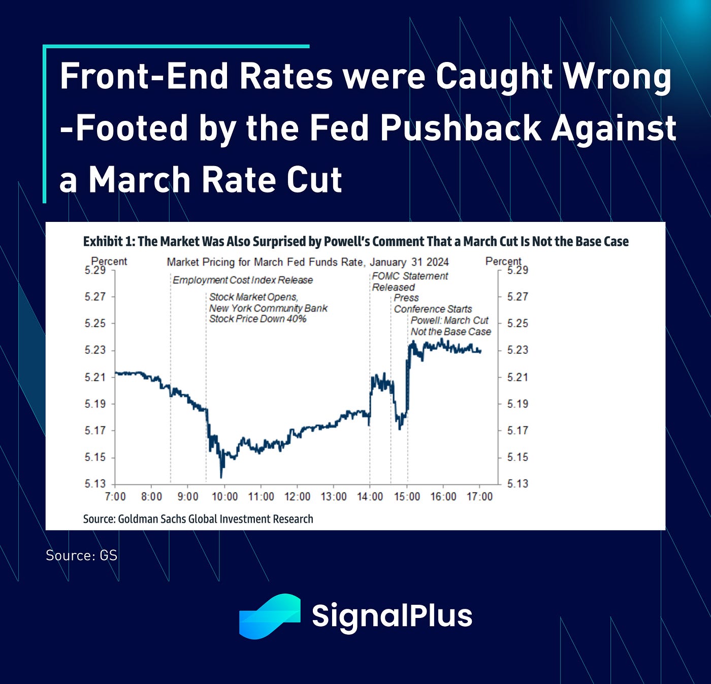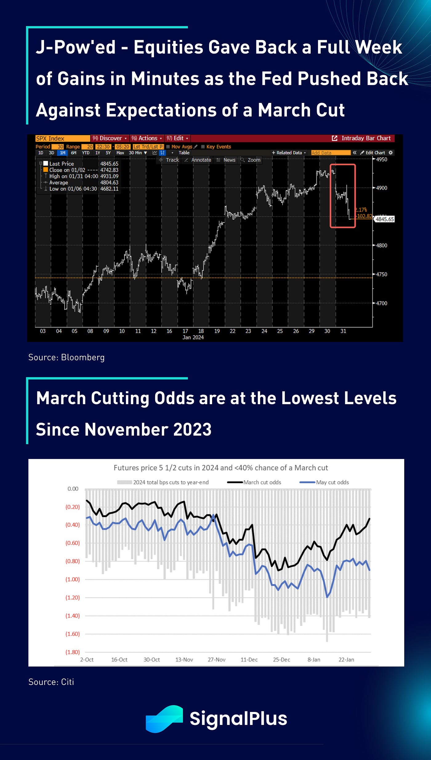 Yesterday’s FOMC meeting and market price action can be pretty much summed up in our opening quotes. While the Fed expectedly removed the hiking bias from their official statement, the market was caught off-side from that explicit hawkish push-back, even if one were to question what “greater confidence” ultimately means. In any case, this was taken as a direct Fed rebuttal against the growing expectations of a March cut, causing OIS rates to jump 10bp from the lows (unwinding the gains from the earlier weak ADP and Employment Cost Index) and easing probability to ~30%.