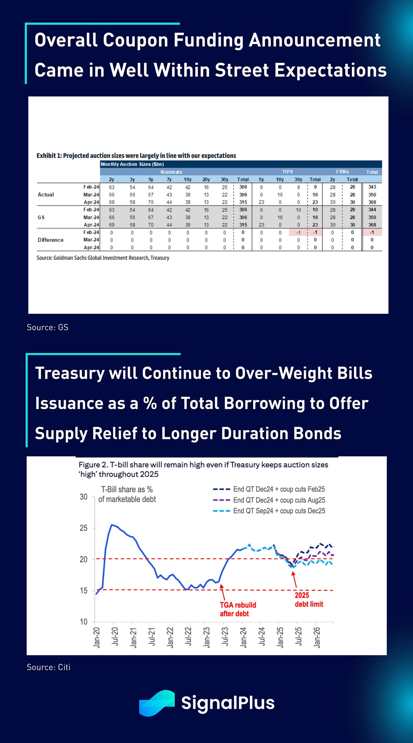 On the maturity mix, the Treasury stated that it expects to at least maintain the current T-bill auction sizes into the end of Q1, followed by a small reduction into the subsequent quarter. In any case, this will keep T-bills share of total issuance above the recommended range, with the Treasury continuing to sacrifice some degree of funding prudence to offer supply relief to longer duration securities.