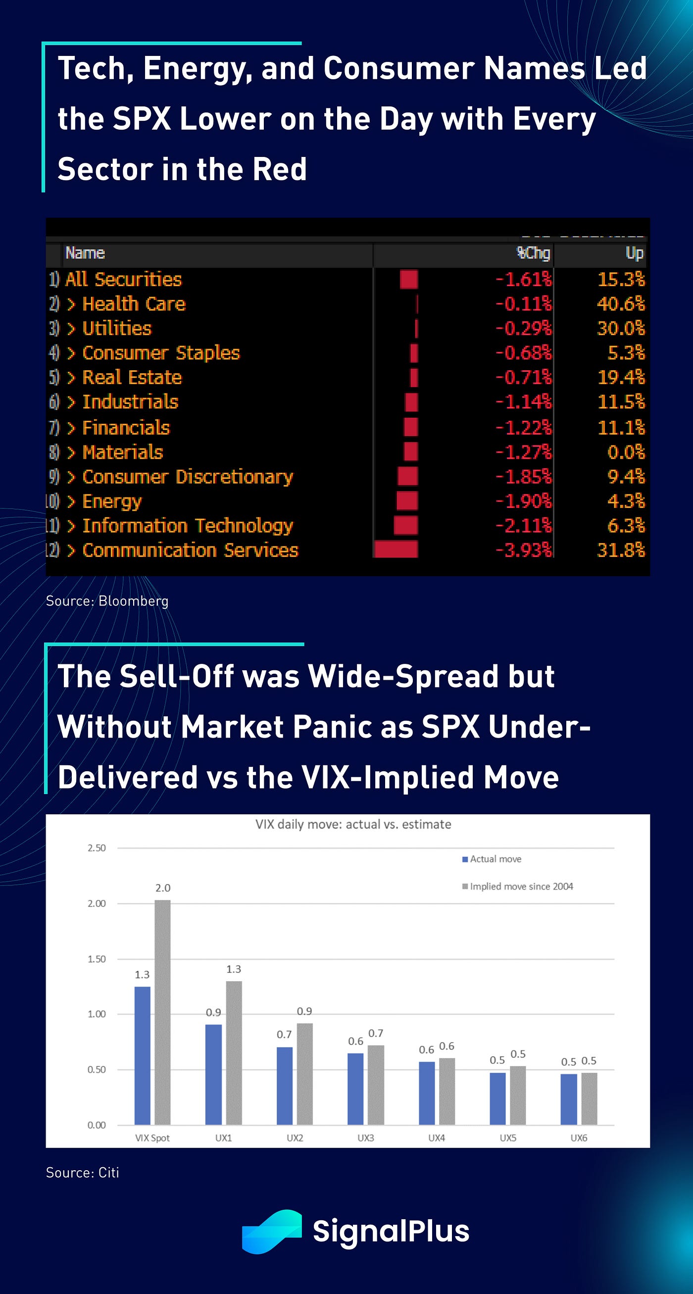 In equities, outside of the hawkish Fed and NYCB scare, earnings disappointed across the board with AMD (-2.6%), Samsung (-2%), Google (-7%), Microsoft (-2.5%), and Disney (-1%) all failing to live up to the lofty heights set by the current prices. Tech, energy, and consumer discretionary sectors led the way lower, though there was no widespread panic as the underlying SPX move actually underperformed the VIX-implieds based on historical data.