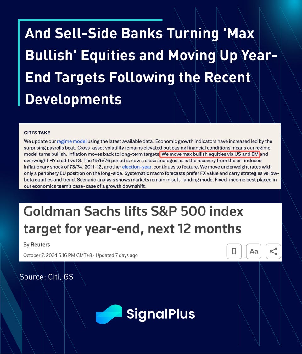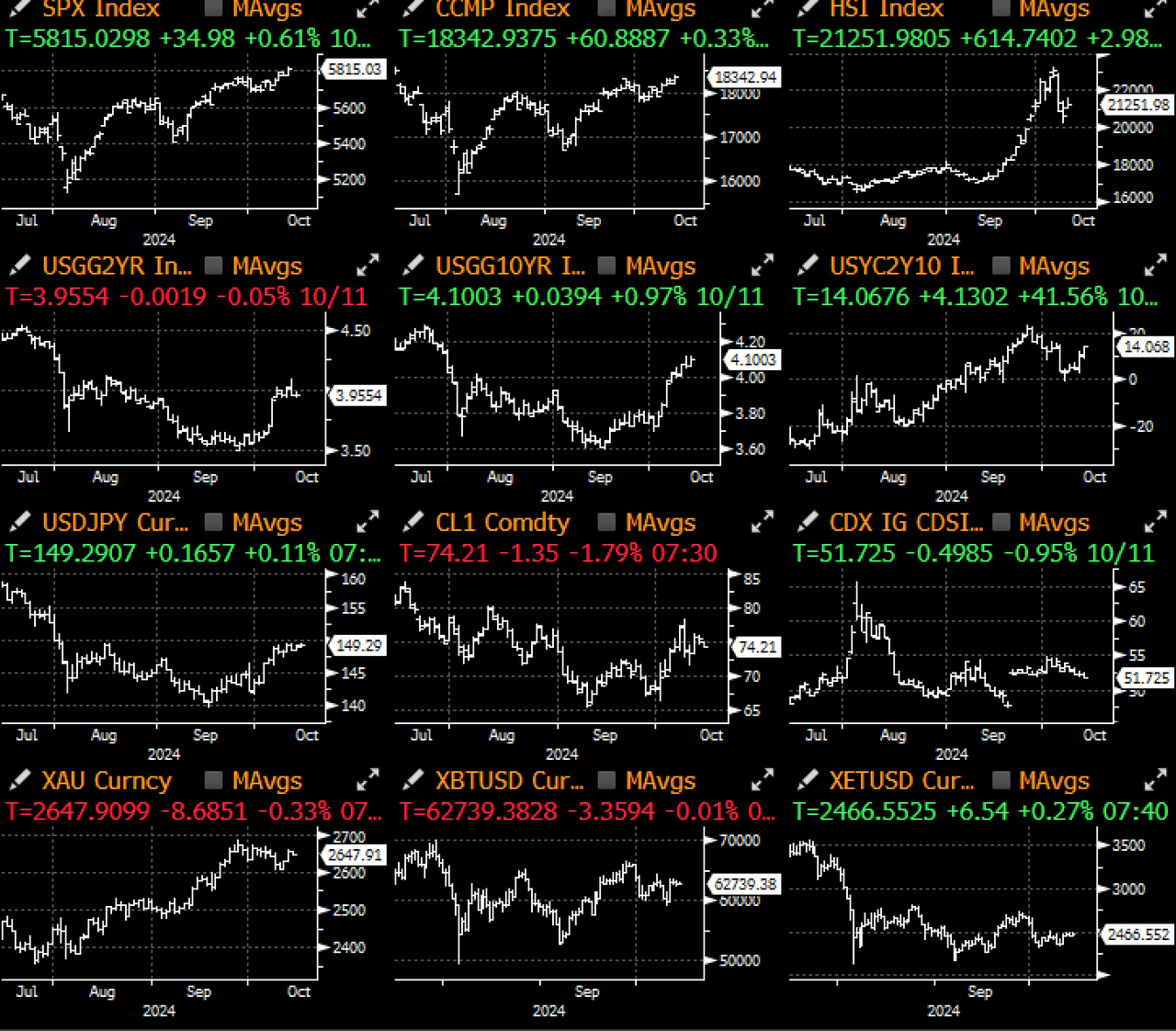 US markets saw relatively firmer data last week with both CPI and PPI coming in on the stronger side. Markets were initially confused by the data impact, but ultimately decided that the ‘core’ inflation trend remained intact and the curve steepening move continued on. US equities made new all time highs, with high beta names and FX breaking out further, as markets continue to expect a ~85%+ chance of a 25bp cut in December. Citi macro strategists are now calling for ‘max bullish equities’ while GS has been busy raising price targets for both US and China stocks over the past few weeks.
