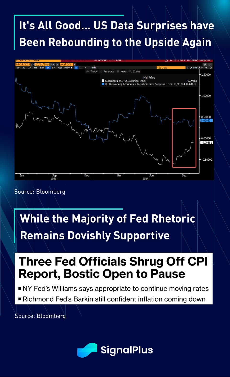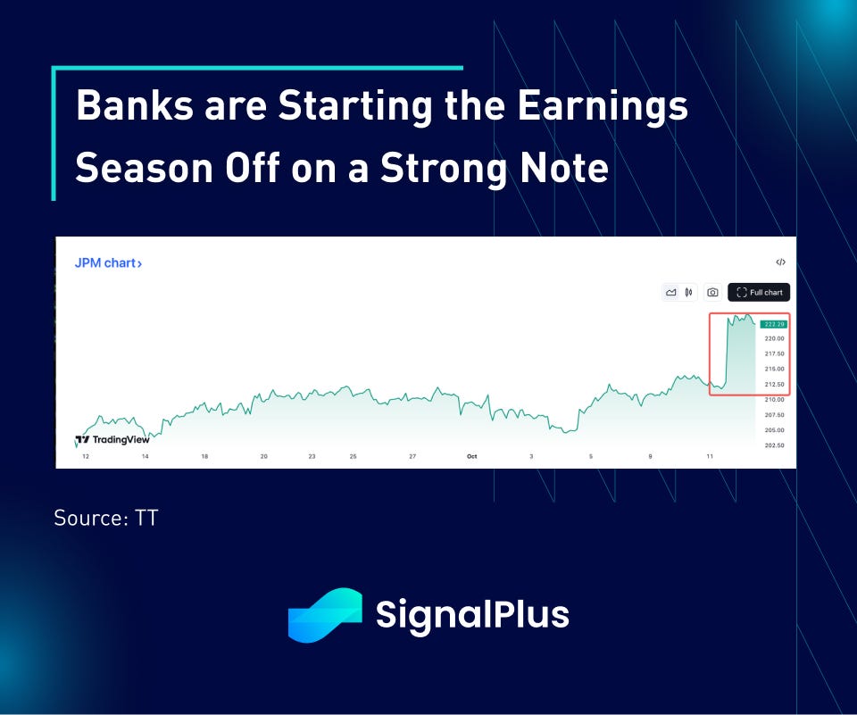 This week will be a holiday-shortened week in the US (Columbus Day), and markets will be riding into the Q3 earnings season on a high with JPM kicking things off on a very strong note. The banking giant saw a 5% jump in its stock price after reporting a surprise gain in interest income and with a revenue forecast increase. The overall KBW bank index also rose to the highest levels since April 2022, with the treasury curve steepening expected to drive further revenue gains for banks in the upcoming quarters.