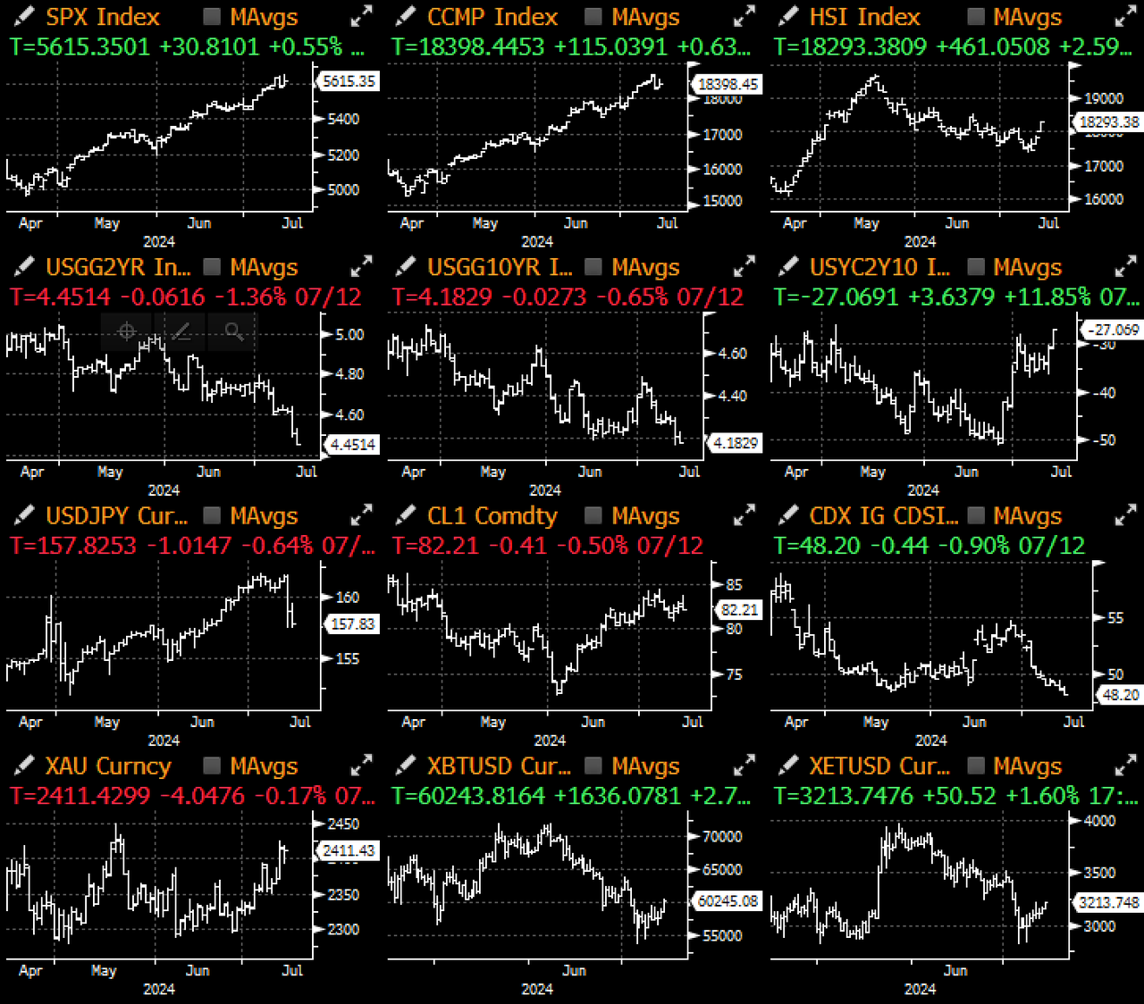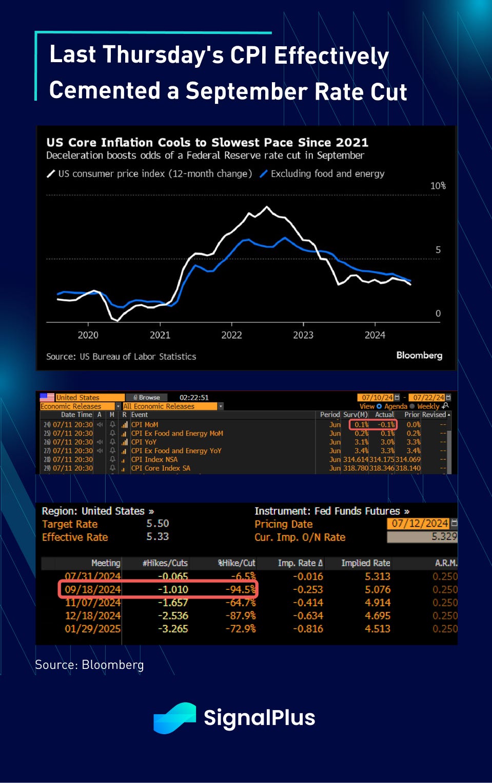 A potential Trump 2nd-term is met against the backdrop of slowing US economic growth and inflation, with last week’s CPI cooling to the slowest pace since 2021 thanks to a long-awaited slow-down in housing costs. Core CPI rose 0.1% from May, the slowest advance in 3 years, while the overall measure fell for the first time since Covid.