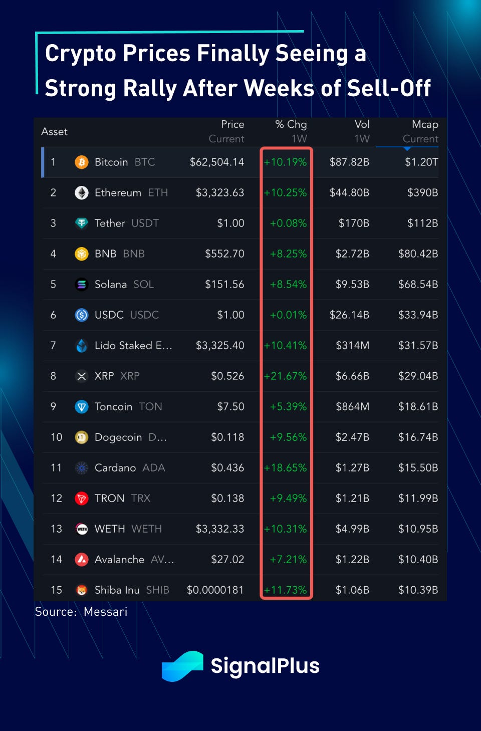 On digital assets, crypto obviously benefitted from Trump’s jump in inauguration odds, with BTC jumping back about $62.5k, rallying over 10% on a week-on-week basis after the recent dreadful sell-off. The Bitcoin conference has apparently reconfirmed Trump’s in-person attendance during the Nashville conference in late July, signaling the administration’s continued support for crypto as a campaign statement.