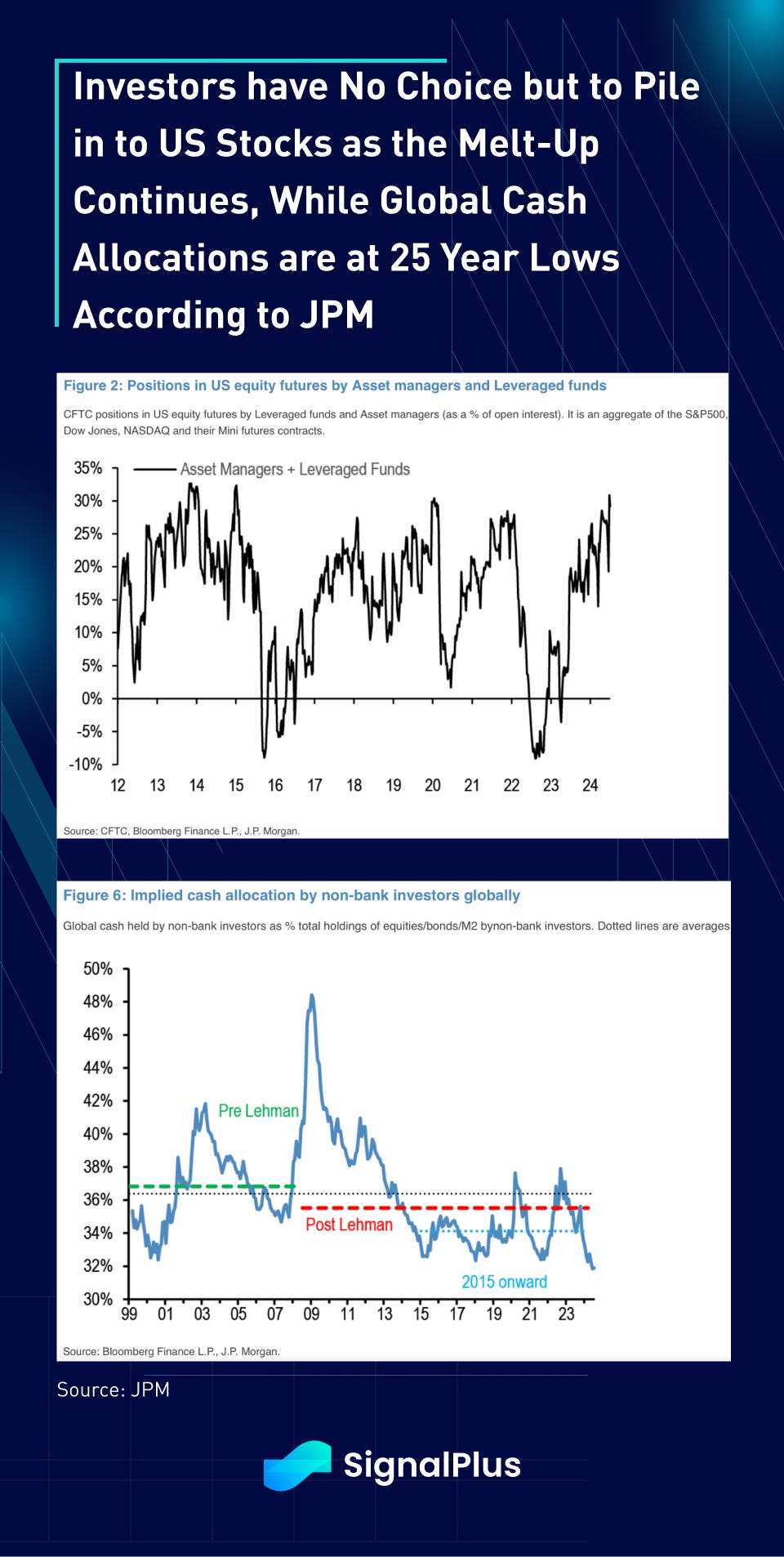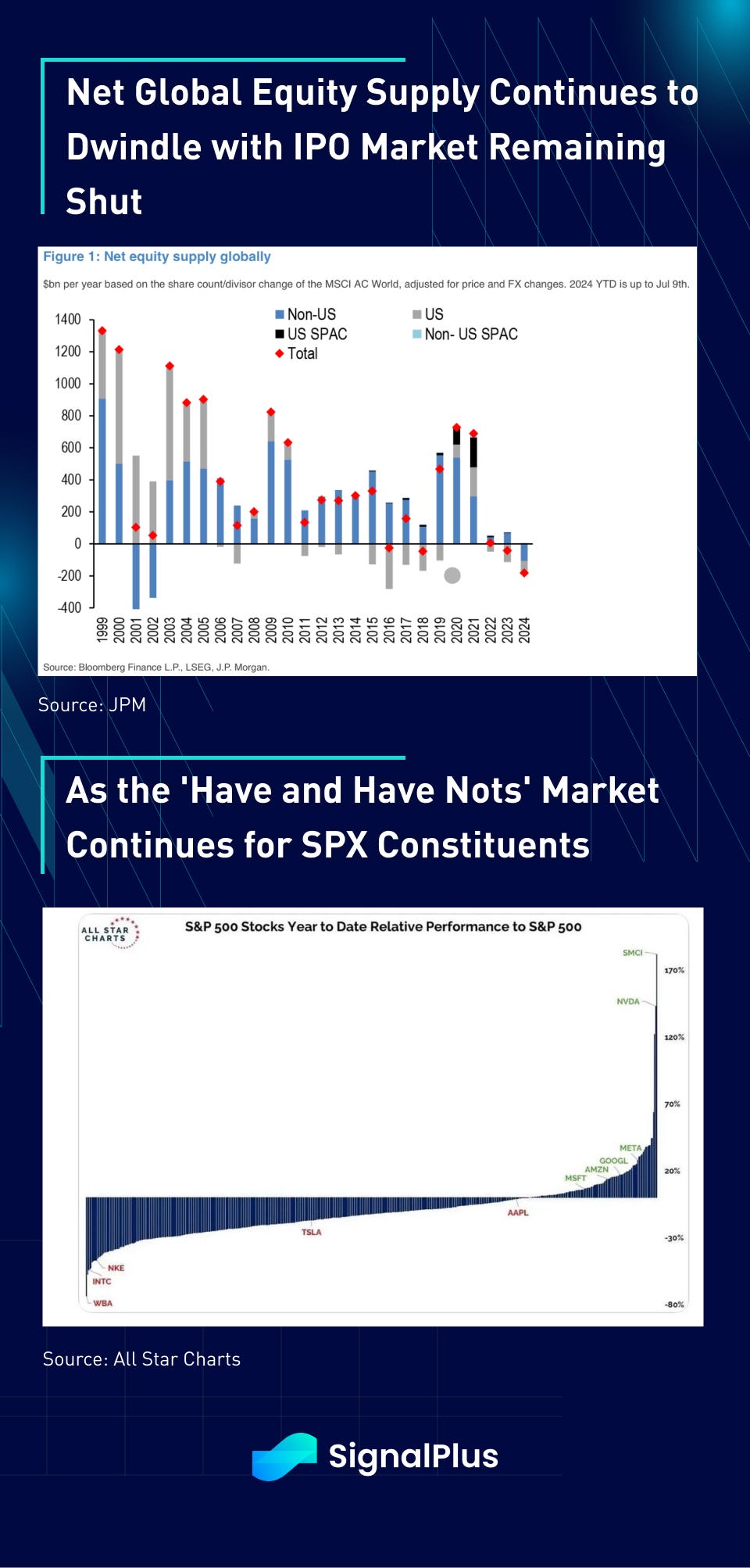 Back on US equities, the SPX continues to hover around ATHs with reluctant bears throwing in the towel after one another. JPM estimates that long equity future positions are at back their highest levels (vs open interest %) over the past 10 years, while cash allocations have breached their lowest levels going back to 2000. However, despite higher prices, new global equity resupply remains negative for the 3rd consecutive year as the IPO market remains shut for most issuers, as the ‘have and have-nots’ environment continues for SPX constituent stocks.
