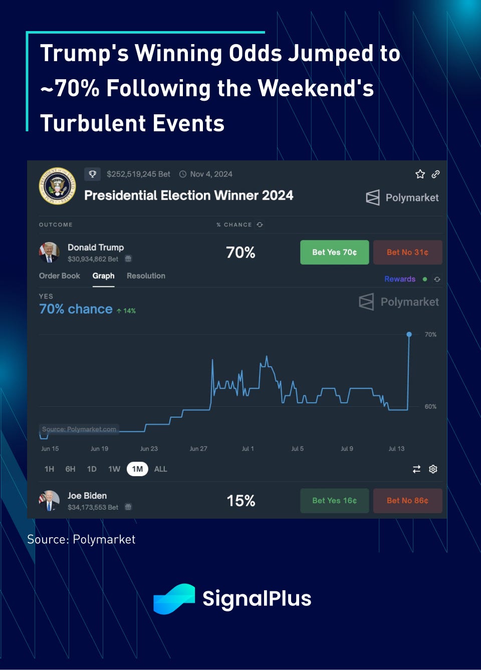 The news flow out of the weekend was obviously punctured by the near catastrophe over former President Trump’s speech in Pennsylvania. What was already shaping up to be a likely Trump presidential win jumped to a near-landslide with betting markets pricing a ~70% winning chance for the former president following the assassination attempt.