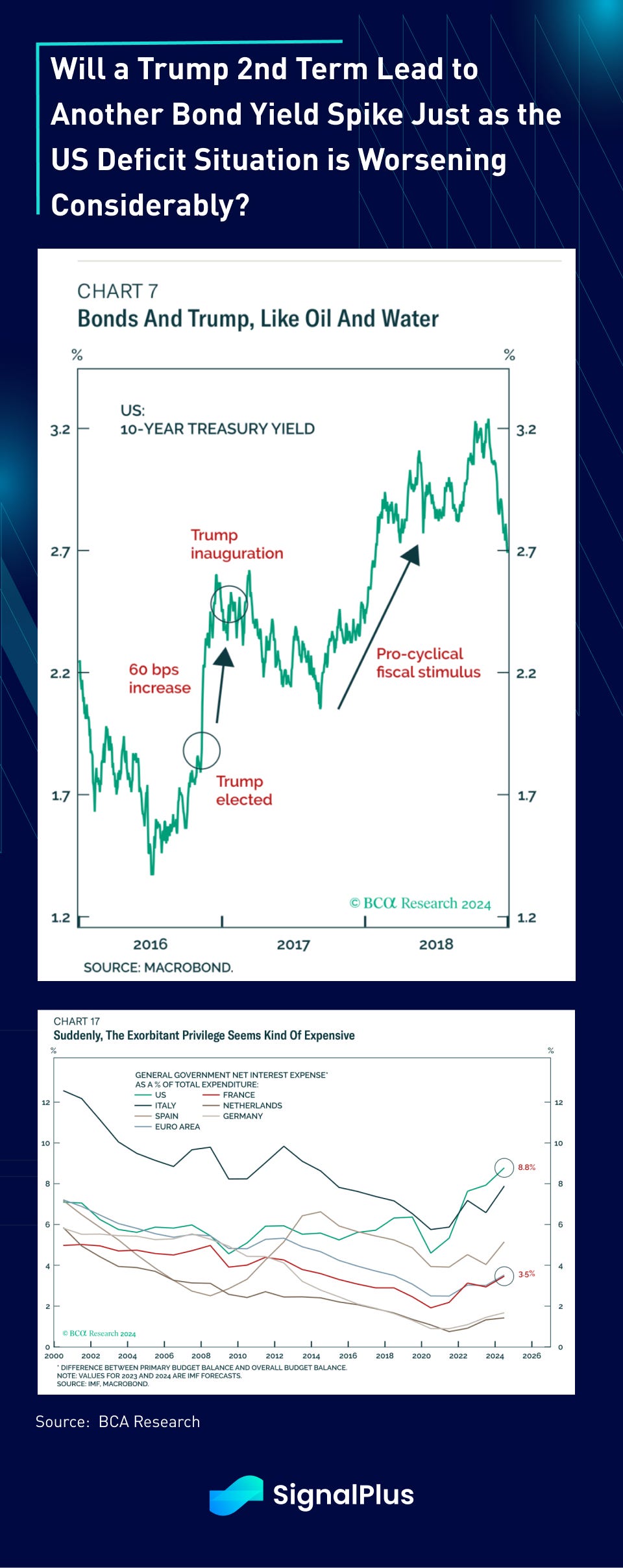 Bond yields will likely see a bear steepening move, as aggressive spending plans will worsen what is already a dire bond supply and budget deficit scenario, with Trump’s first term driving a ~200bp move higher in 10yr yields over 18 months.