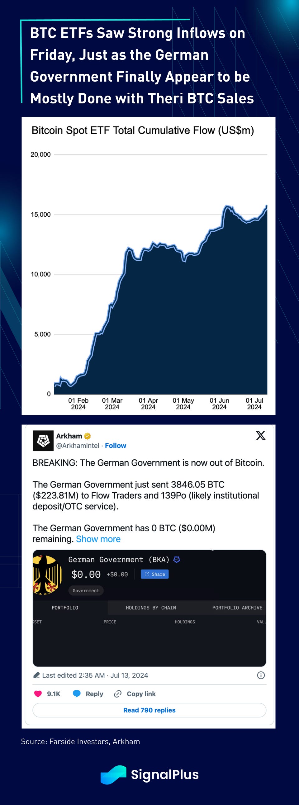 Flows wise, spot BTC ETFs saw large inflows on Friday, totally $310mm even just ahead of the weekend events. This marked the largest recorded inflows since June 5th, with investors finally returning to buy the dip following the belief that the German government has sold all of its BTC according to wallet data tracker Arkham. With that out of the way, the market still has to contend with Mt. Gox repayments where ~140k ($8.5B) of BTC supply are expected to hit the market, though there is certainly more light at the end of the tunnel with an imminent September rate cut and a likely Trump victory providing support for crypto assets. Price action wise, it’s also assuring that BTC managed to hold the low $50k area against the recent sell-off, which was the break-out area just following the January BTC approval, and sentiment will likely pivot back to selling puts / buying dips going forward as we get close to the end of summer and the eventful Q4 period to end a memorable year.