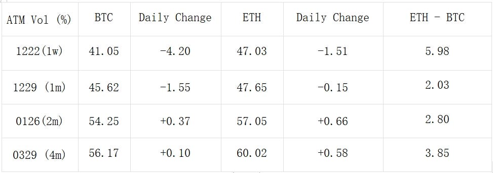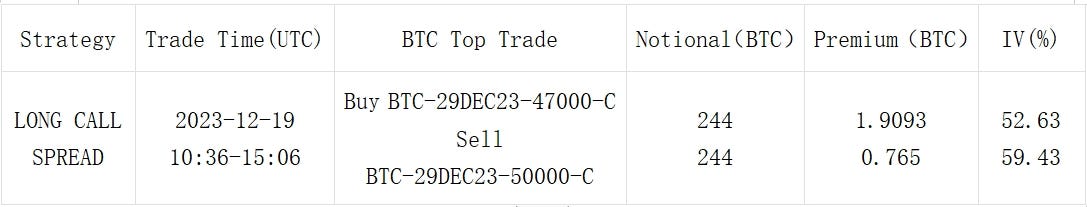 In terms of cryptocurrencies, the price of BTC slightly fell to $42,000 after yesterday’s close, but then gradually recovered almost all losses, closing near even (-0.3%). Regarding options, the near-term implied volatility for both BTC and ETH was once again lowered, with a slight increase in the back-end, leading to a steeper overall curve. This is influenced by the market’s anticipation of a possible SEC decision to approve a BTC ETF at the beginning of January, keeping BTC’s ATM Vol at a local high point for the 12th of January 2024. In trading, a large volume of at-the-money call options for BTC expiring in December were sold off, while calls on the wings for the 12th and 26th of January continued to be bought, partly explaining today’s steep IV Curve. For ETH, the trade of a single-leg, nearly 10,000 ETH 1950 vs 2100 Long Put Spread expiring on the 5th of January drew market attention, providing a hedge for potential downward price volatility at the beginning of the year.