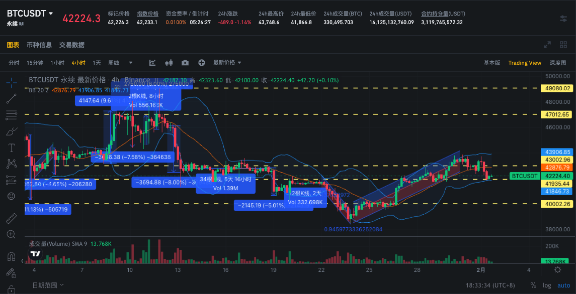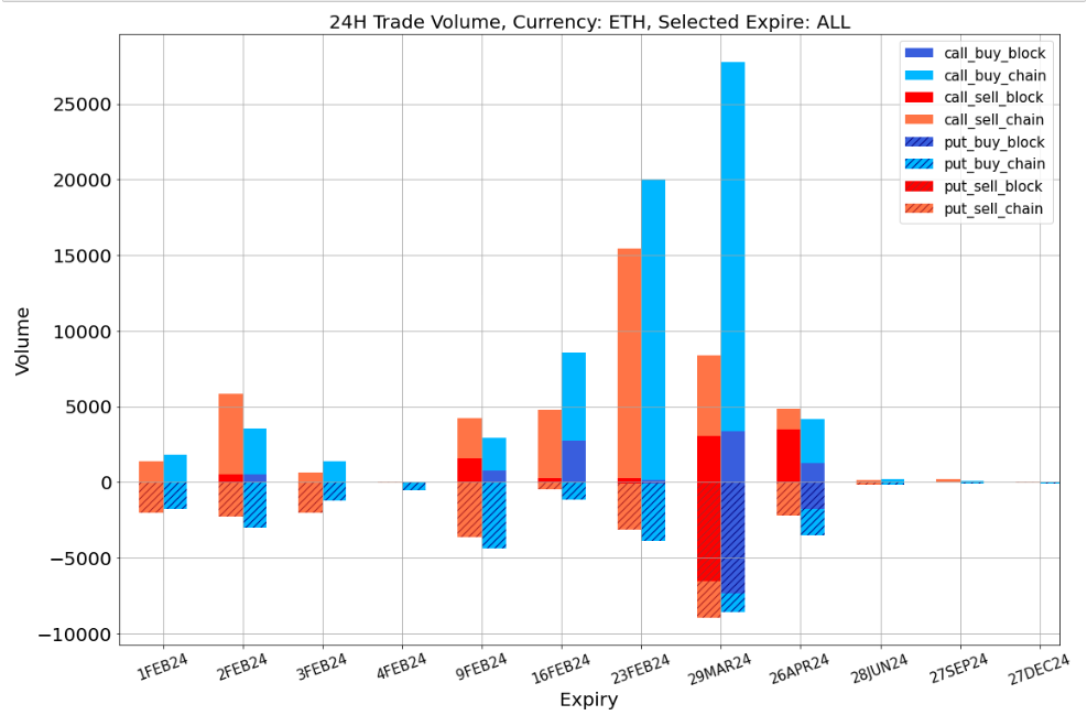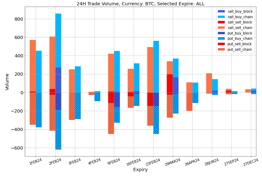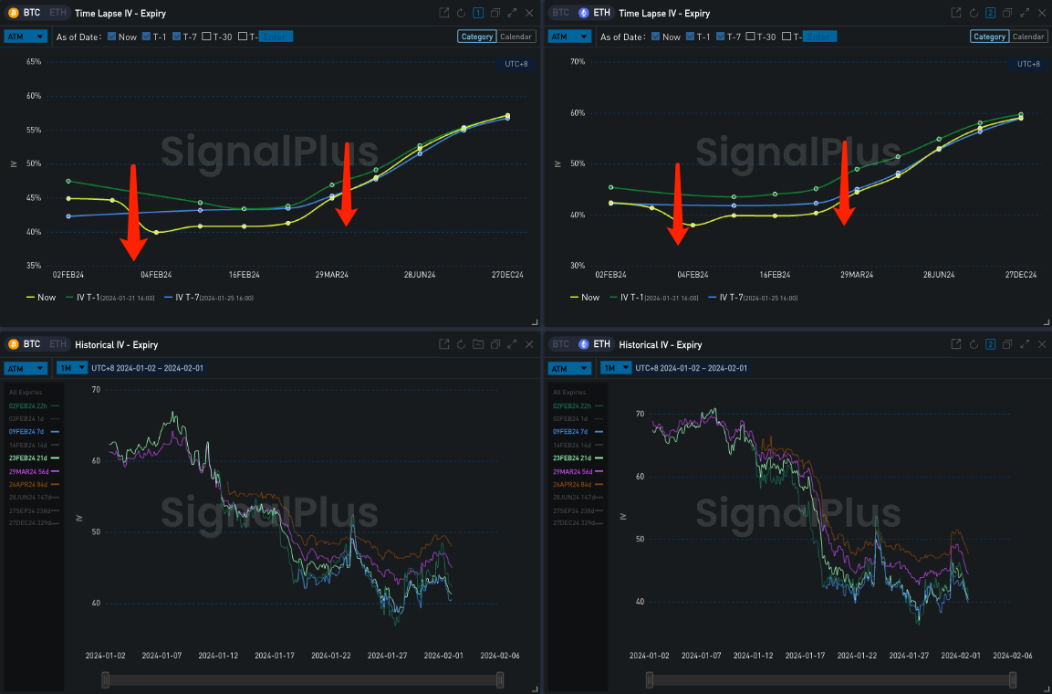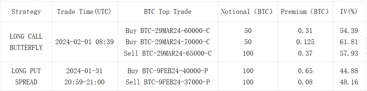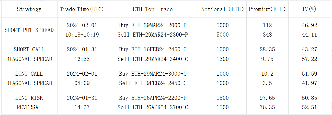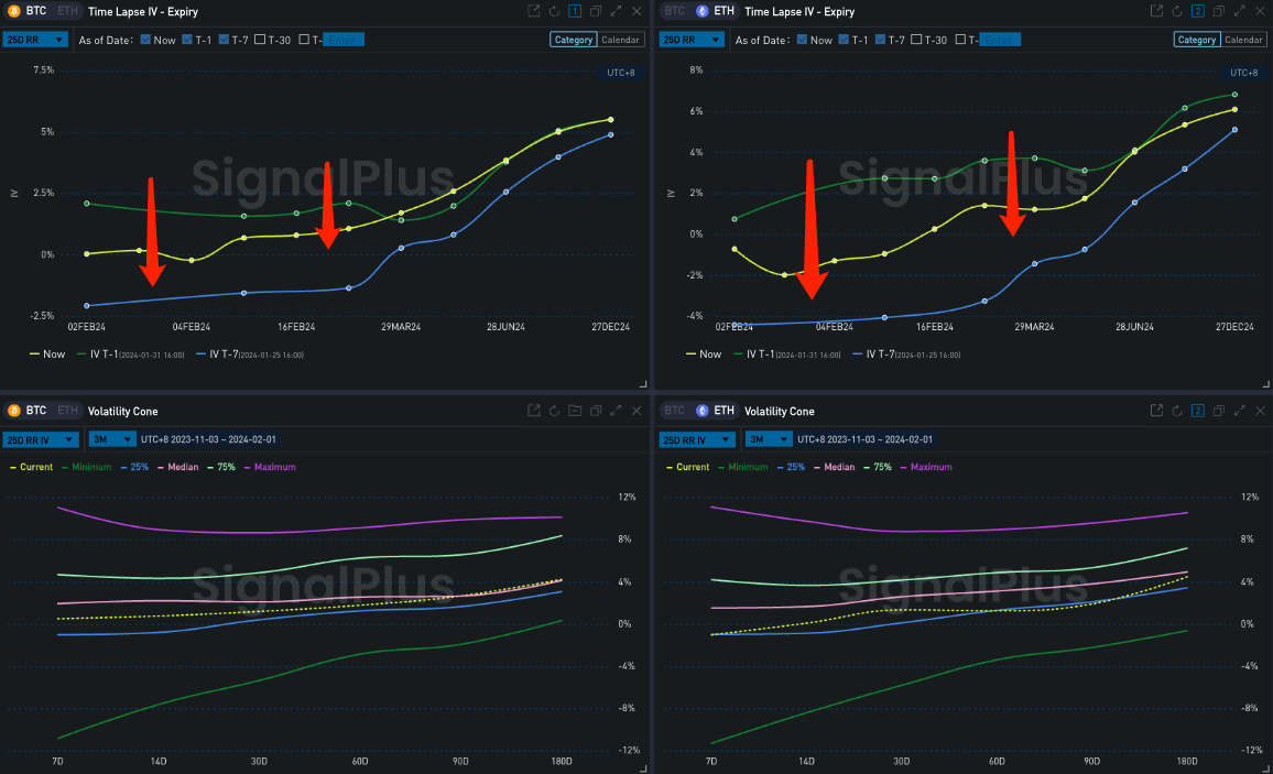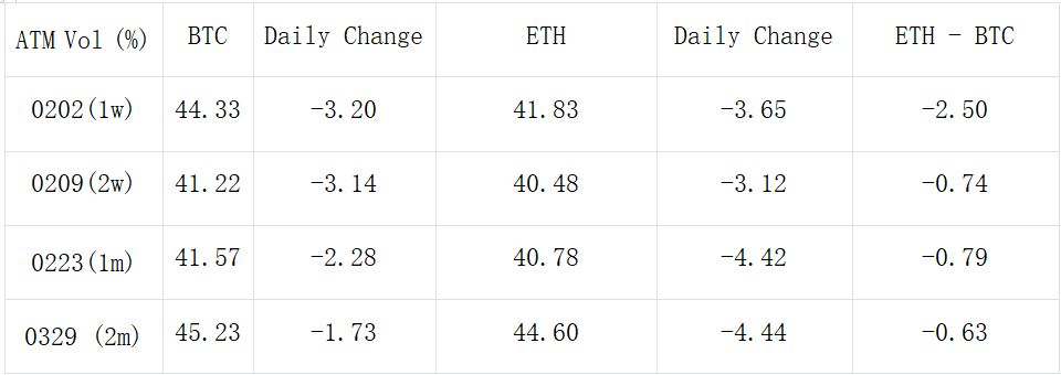 Cryptocurrencies, as risk assets, also faced downward pressure, with BTC falling to around $42,000 and ETH to about $2,270. The large-scale bullish strategy trades stimulated by the consecutive rises in the previous days lost their momentum today. The market trading volume decreased over the past 24 hours, and the Put Spread strategy for February took its place as the focus of the market yesterday. The Vol Skew that had just started to rise in the mid-front end has returned to near zero, and the overall volatility levels of both BTC and ETH have gradually declined after the FOMC meeting, dropping by about 3–4% Vol.