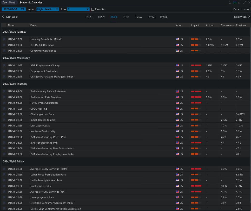 Yesterday (31 JAN), the Federal Reserve held its first FOMC meeting of the new year, announcing it will keep the current interest rates unchanged, in line with market expectations. Following the meeting, Fed officials made hawkish statements, indicating they would not cut interest rates until they are more confident inflation is moving sustainably towards 2% and removed the phrase “might require further tightening” from their statement. Chairman Powell explicitly mentioned that “a rate cut in March is unlikely,” seen as a direct rebuttal by the Fed against the market’s growing expectations for a more dovish policy. The swap market’s expectations for a rate cut in March have now dropped to 36%. In terms of Treasuries, despite the lower-than-expected increase in ADP employment numbers (recording 107,000 versus the expected 145,000) and a slightly lower-than-expected labor cost index pushing yields down, hawkish comments during the FOMC meeting drove yields up again. On the other hand, the U.S. Treasury hinted it’s unlikely to increase issuance size before next year, boosting demand for Treasuries and leading to a subsequent decline in yields, with the two-year/ten-year currently at 4.231% / 3.942%. The three major U.S. stock indices were under pressure and closed down, with the Dow Jones/S&P/Nasdaq falling by 0.83% /1.6% /2.2% respectively, erasing a full week’s gains in just a few minutes and marking the largest single-day drop of the year so far.