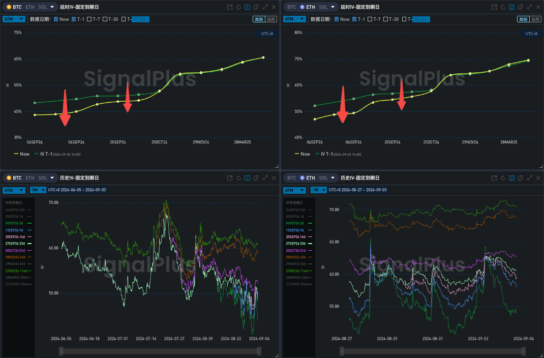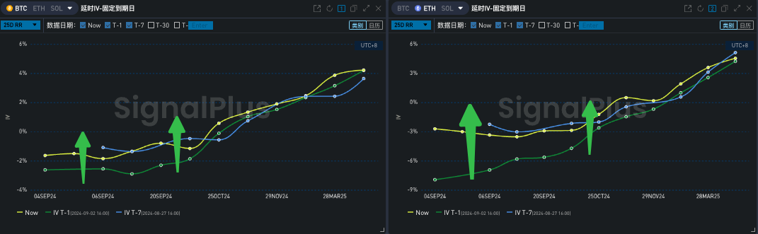 From a Vol Skew perspective, the far end remains elevated due to long-term bullish sentiment, while the positive correlation between short-to-mid-term Risky and price movements is notable. However, it’s important to point out that yesterday’s price action between BTC and ETH showed a marked divergence. On a macro level, significant outflows from BTC ETFs, the negative shift in the Coinbase Premium Index signaling selling pressure, and declining miner profits have all cast a shadow over market sentiment. In terms of flow, short-term bullish demand for ETH has helped drive up the Risky premium. While long-term bullish buy orders for BTC remain, the selling pressure on the front-end Top Side Wing, triggered by the recent price rise, has undoubtedly suppressed the growth in its Skew.