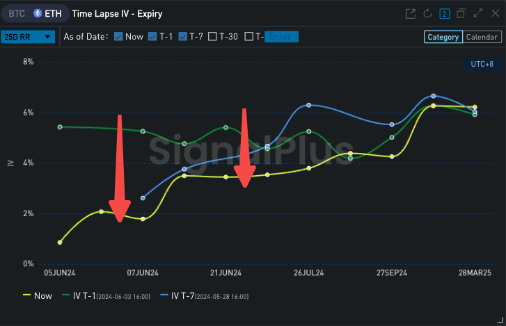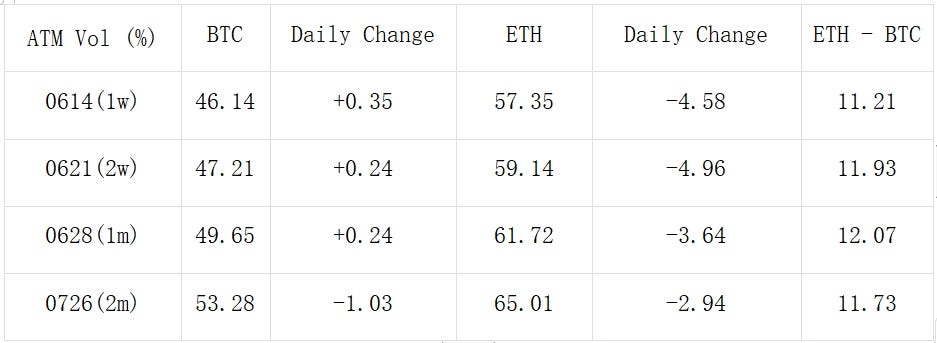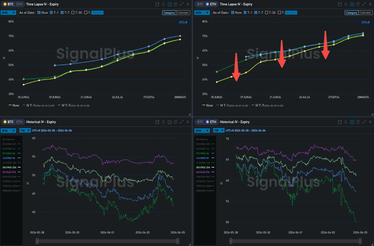 Regarding options, yesterday saw a steep decline across the entire ETH Vol Surface, possibly due in part to ETH’s relatively poor performance compared to BTC in recent days, with prices slowly dropping below $3,800. Additionally, selling pressure on call options at the front end of the options market forced both implied volatility and risk reversals lower. The market’s demand for bullish bets remains mainly focused beyond the end of June, anticipating new demand from the potential launch of an Ethereum spot ETF.