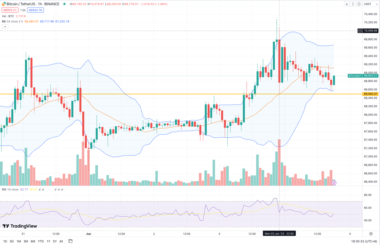 In the realm of digital currencies, BTC continued to rise yesterday after breaking through the resistance level of 68,500, momentarily surpassing the $70,000 mark. However, it quickly retreated from the high and continued to fluctuate over the next three hours. During this period, a technical malfunction occurred at the New York Stock Exchange, causing several stocks to drop by more than 99%.