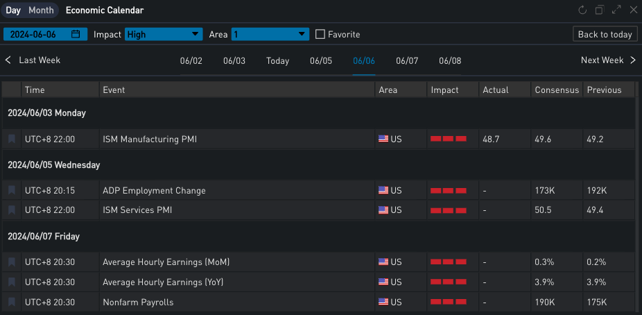 Yesterday (June 3rd), the U.S. Manufacturing PMI recorded a reading of 48.7, which was below expectations and the previous value. Additionally, the Atlanta Federal Reserve’s GDPNow model revised down its estimate for U.S. GDP growth in the second quarter from 2.7% to 1.8%, highlighting the recent softening in U.S. economic data. U.S. Treasury yields continued to decline, with the ten-year yield falling for the fifth consecutive day to 4.382%. The two-year yield, sensitive to rate policy, barely held above 4.8%. Looking ahead to this week, the most significant data will be Friday’s non-farm payrolls, while next Wednesday evening’s CPI and the FOMC meeting will also be focal points for the market.