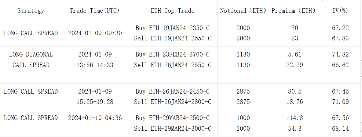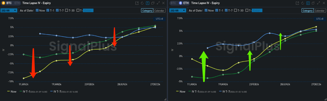 In terms of options, the Doomsday Implied Volatility quickly escalated before the decision day, breaking through the 100% Vol threshold, intensifying the inversion of the curve. Observing from the Vol Skew, BTC and ETH once again showed opposite trends. The 25 dRR of BTC overall significantly decreased. From the overall market trading, we observed an increase in the buying of 43000 to 39000 Puts on the options chain. On the Call side, even though the buying enthusiasm near the ATM and at the 50000 level remained high, there were more Call selling trades on the Wing for BTC relative to ETH, suggesting possible hedging operations in a high IV environment, or as the selling leg in bullish (ratio) spread transactions.